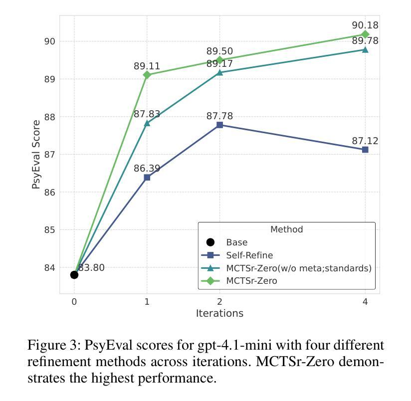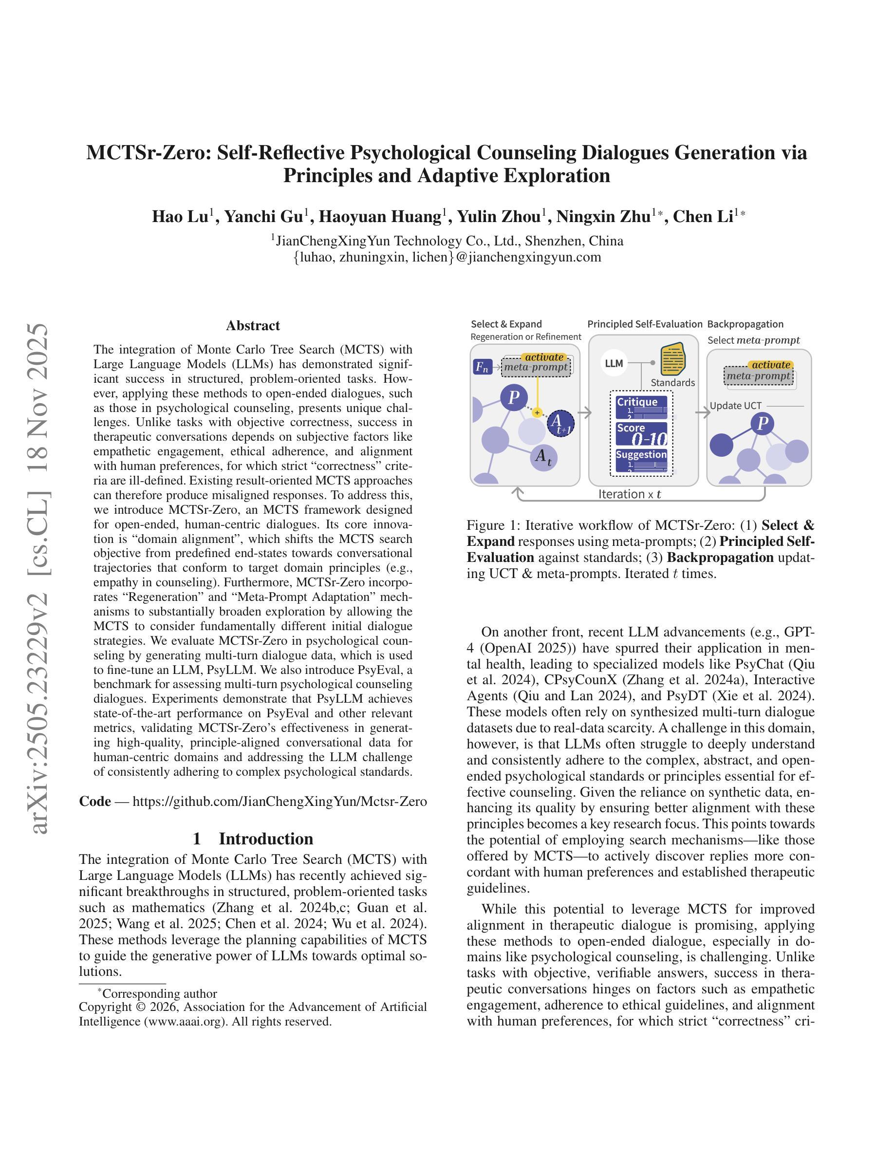将Monte Carlo树搜索(MCTS)与大型语言模型(LLM)的结合在结构化和问题导向的任务中取得了显著的成功。然而,将这些方法应用于开放式对话,如心理咨询中的对话,却存在独特的挑战。不同于具有客观正确性的任务,治疗性对话的成功取决于主观因素,如共情投入、道德遵守以及与人类偏好的一致性,而严格的“正确性”标准则定义不清。因此,现有的以结果为导向的MCTS方法可能会产生不匹配的回应。为解决这一问题,我们推出了MCTSr-Zero,这是一个为开放式、以人为中心的对话而设计的MCTS框架。它的核心创新点是“领域对齐”,这将MCTS的搜索目标从预设的终端状态转向符合目标领域原则的对话轨迹(例如在咨询中的共情)。此外,MCTSr-Zero还融入了“再生”和“元提示适应”机制,通过允许MCTS考虑根本不同的初始对话策略,从而大大拓宽了探索范围。我们通过生成多轮对话数据来评估MCTSr-Zero在心理咨询方面的表现,这些数据被用来微调LLM(PsyLLM)。我们还介绍了PsyEval,一个用于评估多轮心理咨询对话的基准测试。实验表明,PsyLLM在PsyEval和其他相关指标上达到了最新技术水平,验证了MCTSr-Zero在生成高质量、符合原则的对话数据方面的有效性,解决了LLM在持续遵守复杂心理标准方面的挑战。