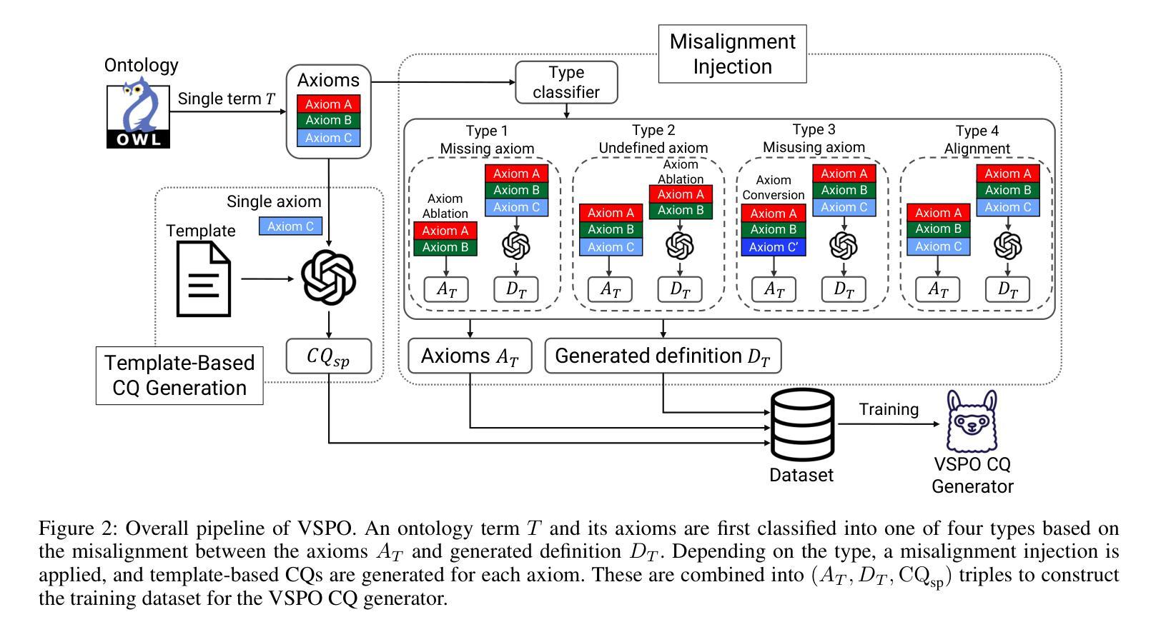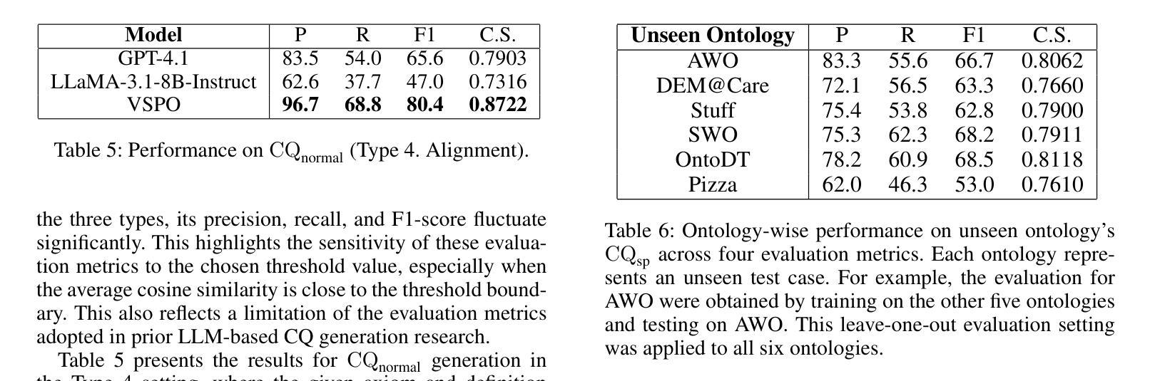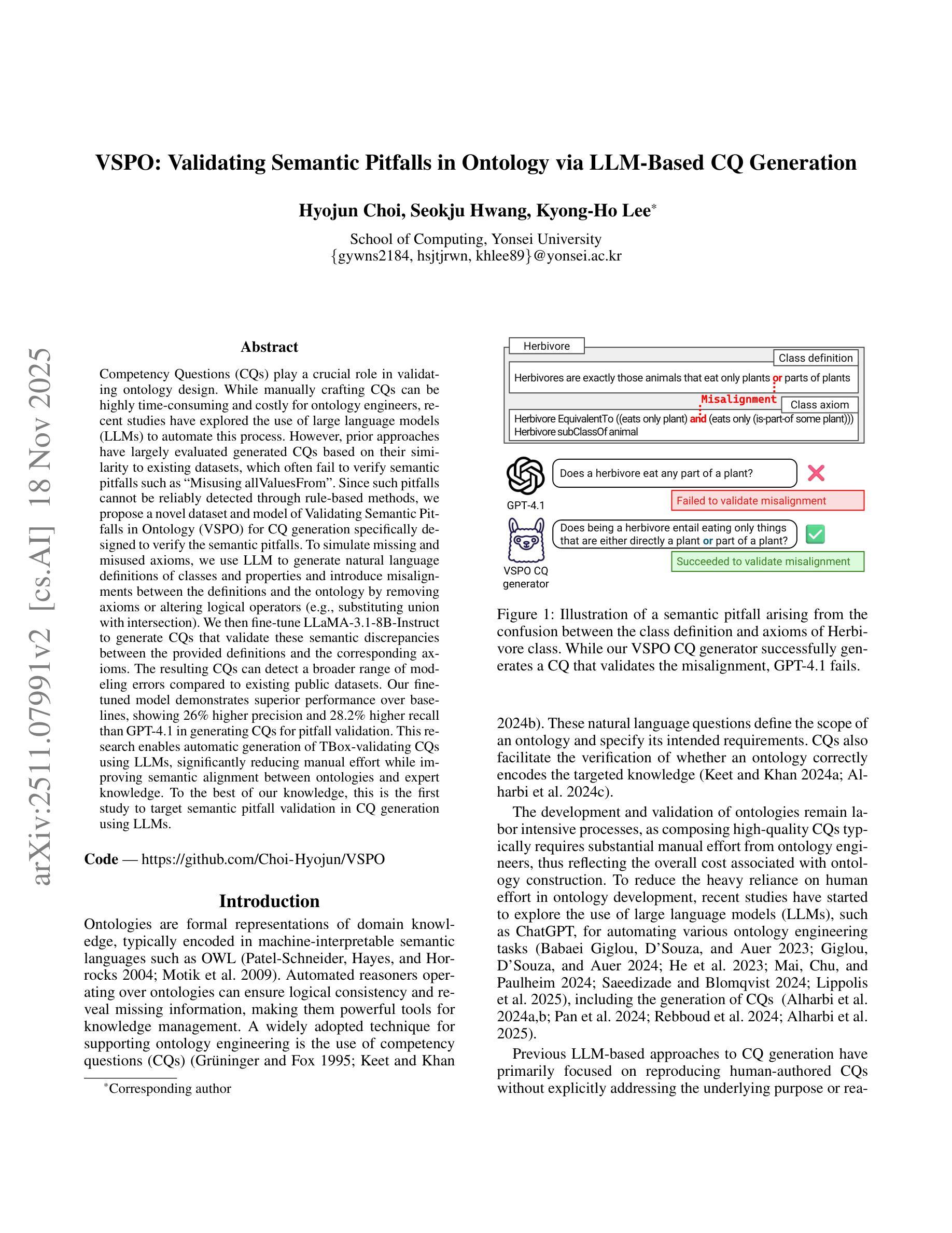 能力问题(CQs)在验证本体设计方面发挥着至关重要的作用。虽然手工编制CQs对于本体工程师来说可能既耗时又成本高昂,但最近的研究已经探索了使用大型语言模型(LLM)来自动化这一过程。然而,先前的方法大多基于生成的CQs与现有数据集的相似性进行评估,这往往无法验证语义陷阱,例如“误用allValuesFrom”。由于这种陷阱无法可靠地通过基于规则的方法进行检测,我们针对CQ生成提出了一个专门用于验证语义陷阱的新数据集和模型——本体语义陷阱验证(VSPO)。为了模拟缺失和误用的公理,我们使用LLM生成类和属性的自然语言定义,并通过移除公理或改变逻辑运算符(例如,用交集替换并集)来引入定义与本体之间的不匹配。然后,我们对LLaMA-3.1-8B-Instruct进行微调,生成验证这些语义差异(存在于提供的定义和相应公理之间)的CQs。生成的CQs能够检测比现有公共数据集更广泛的建模错误。我们的微调模型相对于基线表现出卓越的性能,在生成用于陷阱验证的CQs方面,相比GPT-4.1,具有26%的更高精度和28.2%的更高召回率。这项研究能够使用LLM自动生成验证TBox的CQs,显著减少手动工作,同时提高本体与专业知识之间的语义对齐。据我们所知,这是首次使用LLM针对CQ生成中的语义陷阱验证进行研究。