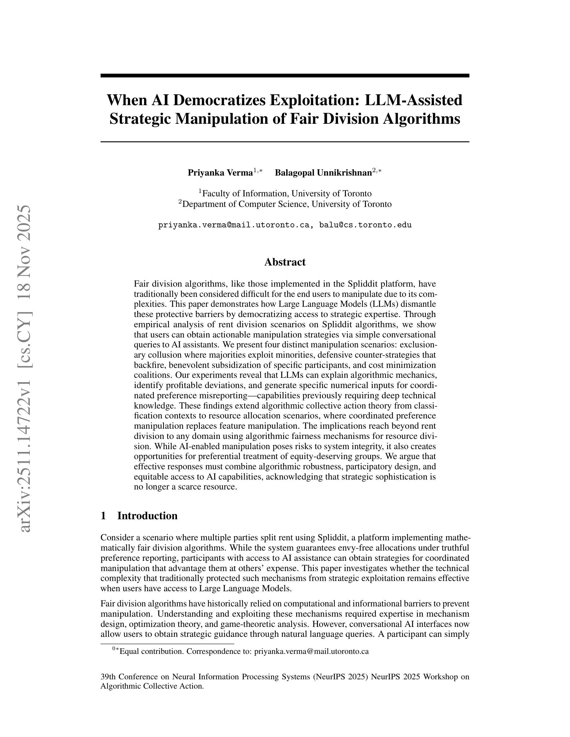 资源公平分配算法,如Spliddit平台所实现的算法,由于其复杂性,传统上被认为难以供最终用户使用。本文展示了大型语言模型(LLM)如何通过普及战略专业知识来消除这些保护壁垒。通过对Spliddit算法中的租金分配情景进行实证分析,我们表明用户可以通过对人工智能助理进行简单的查询来获得可行的操纵策略。我们提出了四种不同的操纵情景:多数人对少数人的排斥性勾结、适得其反的防御性反击策略、对特定参与者的仁慈补贴以及成本最小化联盟。我们的实验表明,LLM可以解释算法机制、发现有利偏差,并生成协调偏好误报的特定数值输入——这些能力以前需要深厚的技术知识。这些发现将算法集体行动理论从分类背景扩展到资源分配场景,其中协调偏好操纵取代了特征操纵。其影响不仅仅局限于租金分配,而且延伸到使用算法公平机制进行资源分配的任何领域。虽然人工智能驱动的操纵对系统完整性构成风险,但它也为应得到公平待遇的群体提供了优待的机会。我们认为,有效的应对措施必须结合算法稳健性、参与性设计和公平的AI能力访问,同时认识到战略精细不再是一种稀缺资源。