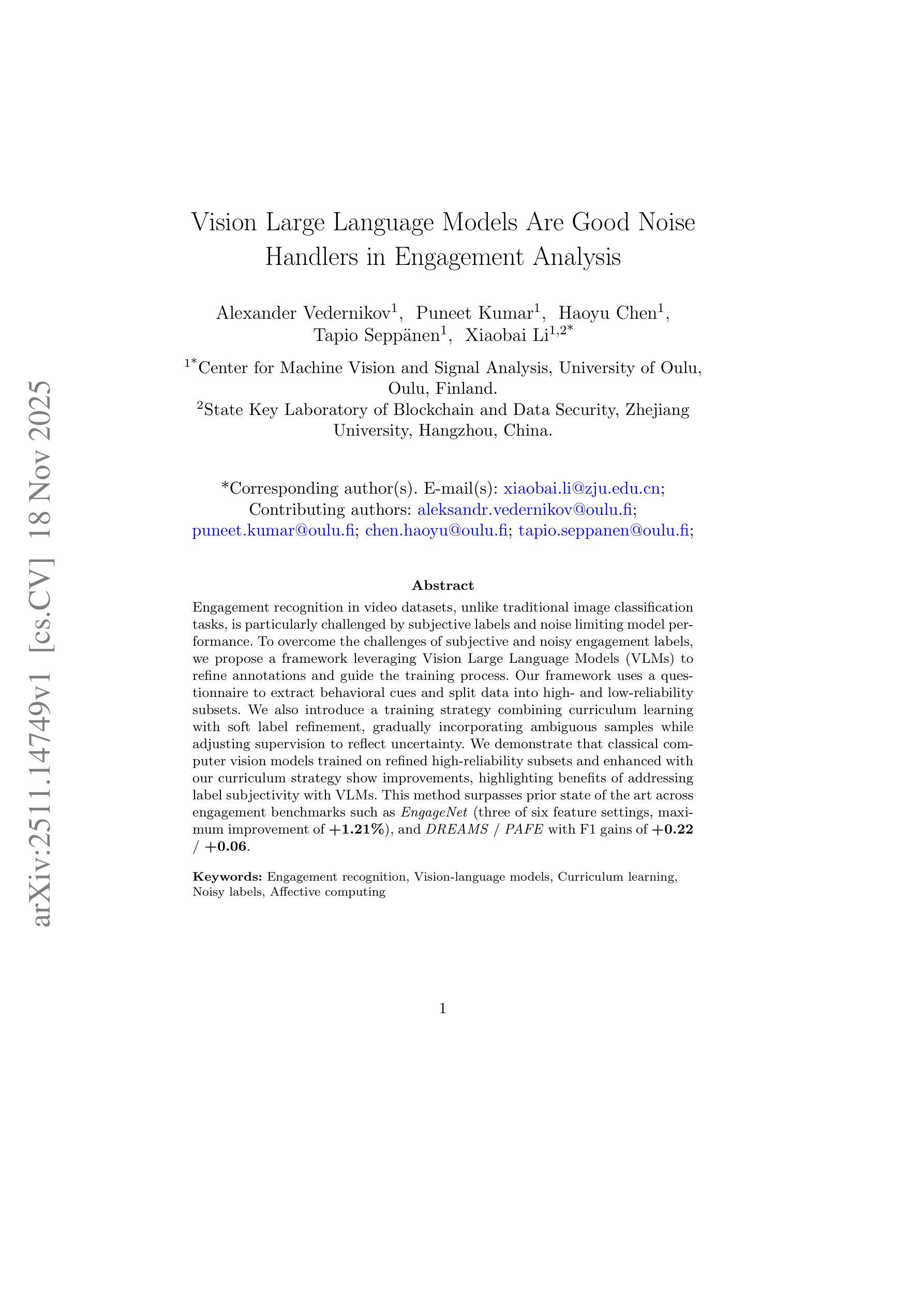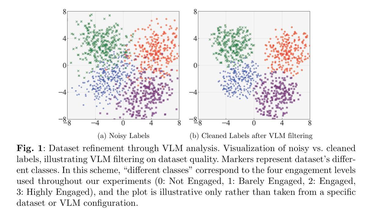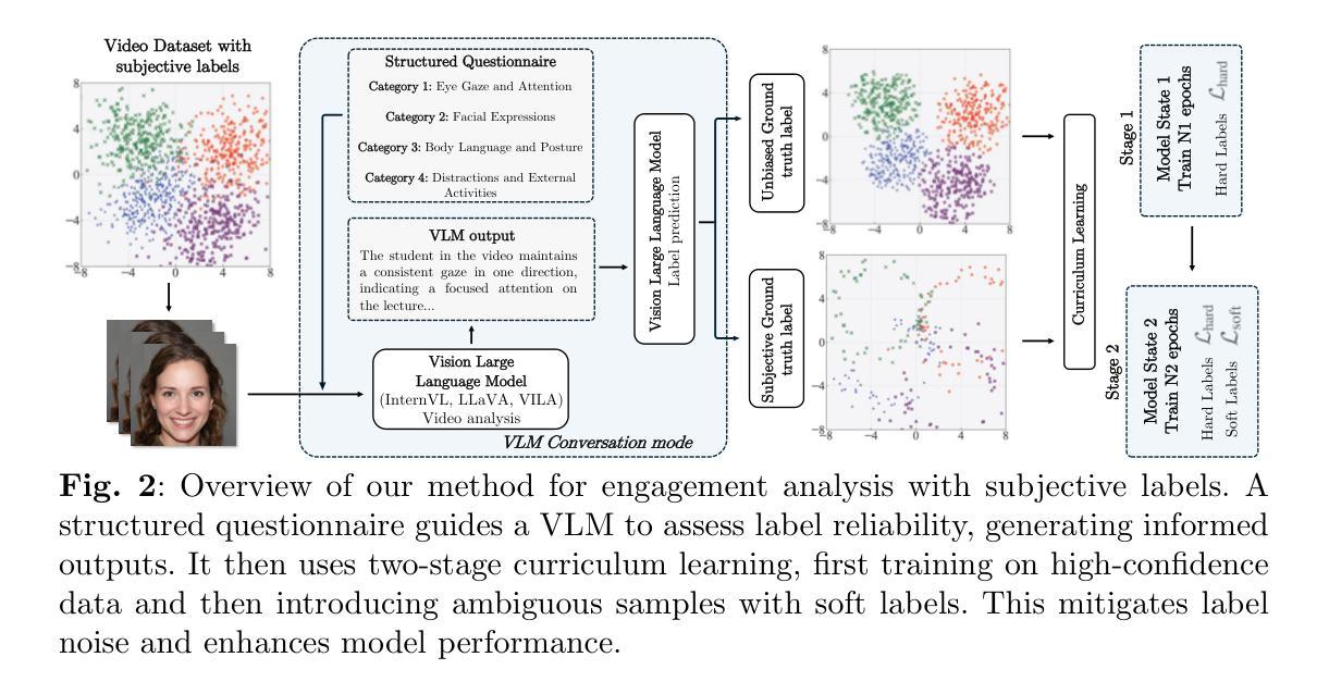 在视频数据集上进行参与度识别与传统的图像分类任务不同,面临着主观标签和噪声对模型性能的挑战。为了克服这些挑战,我们提出了一种利用视觉大型语言模型(VLMs)的框架,以优化注释并引导训练过程。我们的框架通过问卷调查提取行为线索,并将数据分为高可靠性和低可靠性子集。我们还结合了课程学习与软标签优化策略,逐步引入模糊样本,同时调整监督以反映不确定性。在优化后的高可靠性子集上训练的经典计算机视觉模型,结合我们的课程策略,表现出改进的效果,突显了使用VLMs解决标签主观性的好处。该方法超越了现有的参与度基准测试水平,如EngageNet(六个特征设置中的三个,最高改进+1.21%),并在DREAMS/PAFE上实现了F1得分的+0.22/+0.06的增益。