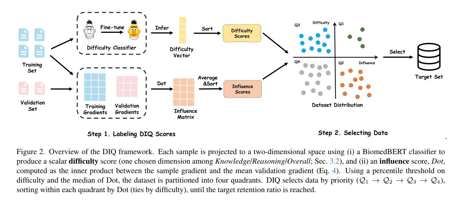 - 难度影响象限(DIQ)策略结合样本的难度和梯度影响力进行数据选择。