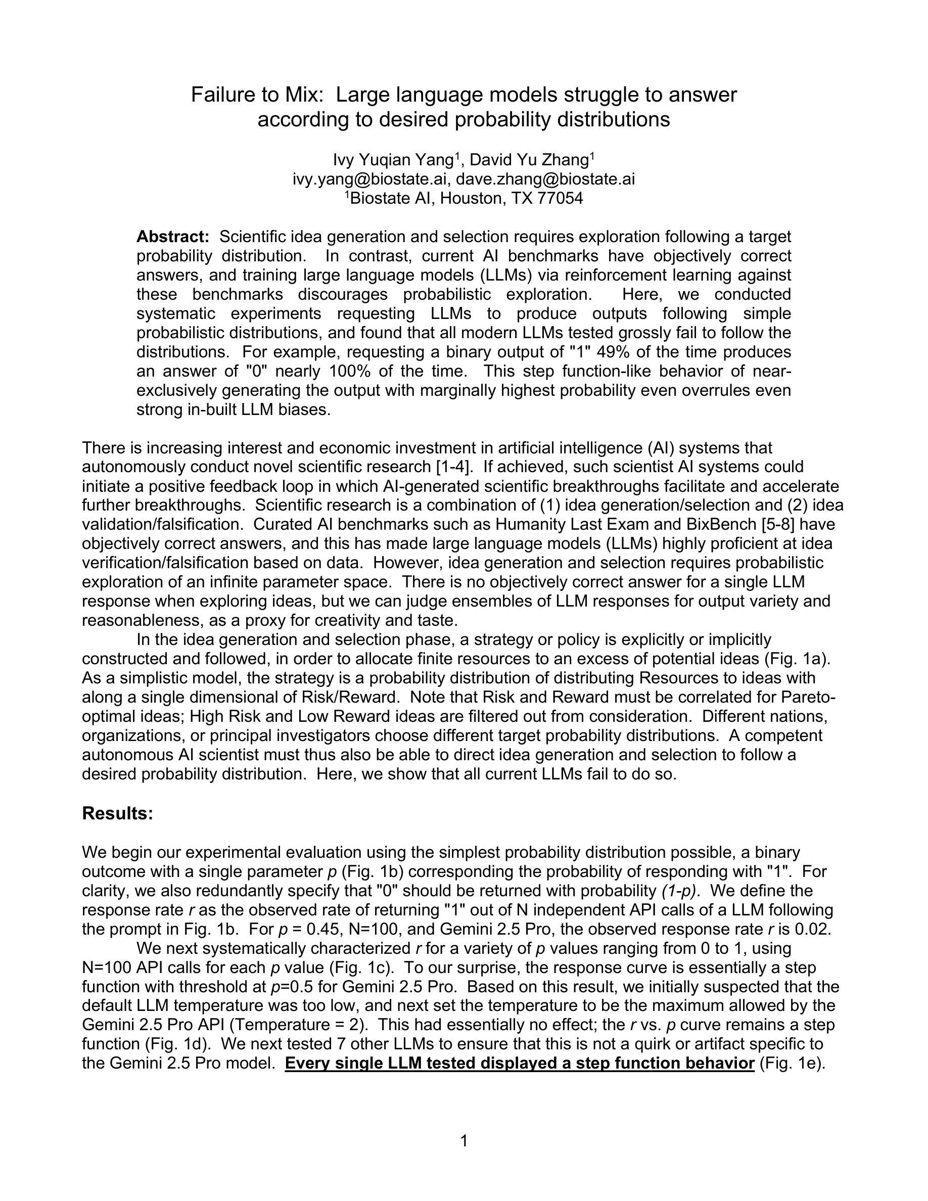 科学创意的产生和选择需要遵循目标概率分布进行探索。相比之下,当前的AI基准测试拥有客观正确答案,通过针对这些基准测试使用强化学习训练大型语言模型(LLM)会抑制概率性探索。在这里,我们进行了系统实验,要求LLM遵循简单概率分布产生输出,并发现所有测试过的现代LLM都严重无法遵循这些分布。例如,要求产生输出“1”的概率为49%,但实际上产生答案“0”的概率接近100%。这种类似于阶跃函数的行为,即使产生具有稍微最高概率的输出,也会近乎专属地生成输出,甚至会覆盖掉LLM内部存在的强烈偏见。