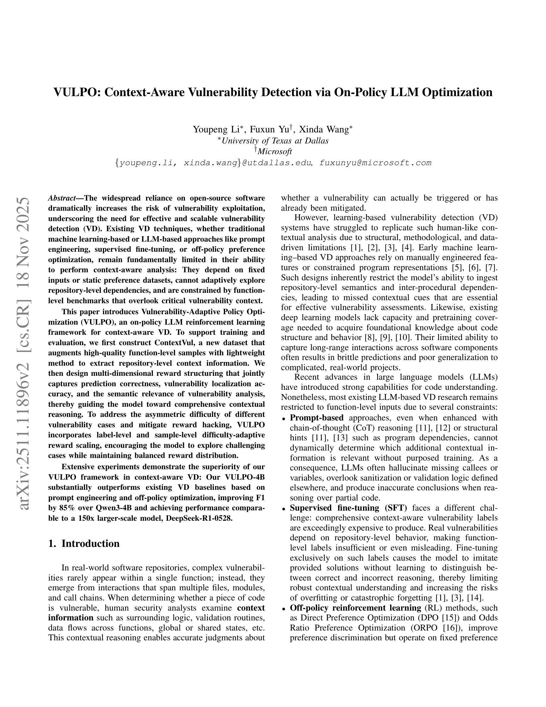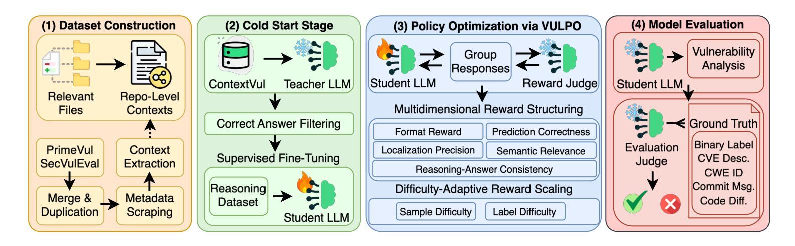 开源软件的广泛应用增加了漏洞利用的风险,凸显了对有效且可扩展的漏洞检测(VD)的需求。现有VD技术存在上下文感知分析的局限性。本文提出一种基于策略的漏洞自适应优化(VULPO)框架,结合上下文感知VD。为支持训练和评估,构建了ContextVul数据集,设计多维奖励结构,并引入标签级别和样本级别的难度自适应奖励缩放。实验证明,VULPO框架在上下文感知VD中表现卓越,显著提高性能。