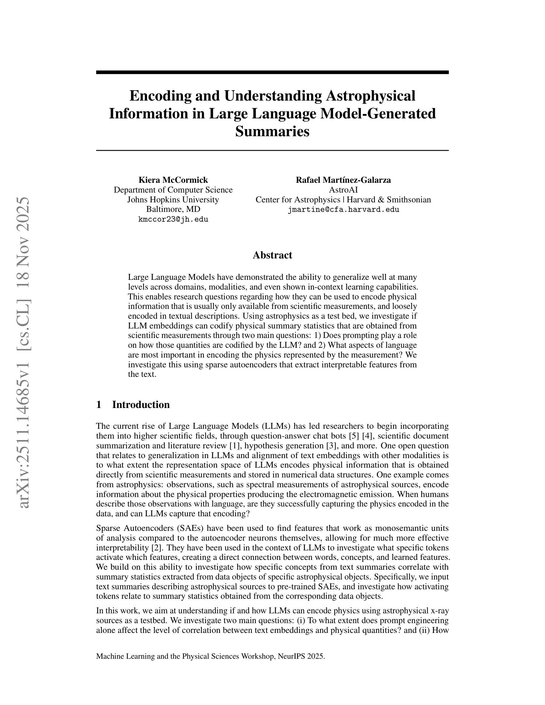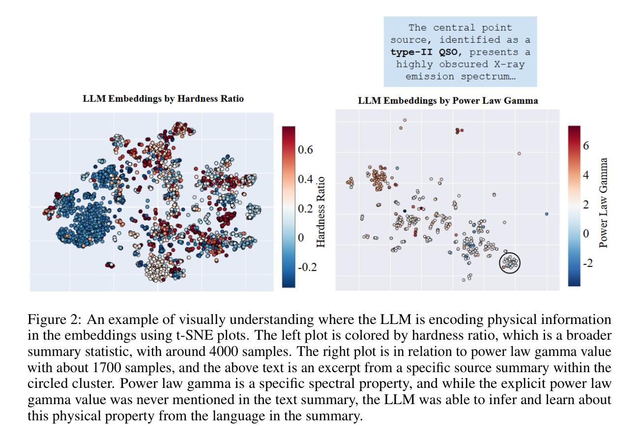 大型语言模型已经显示出在多领域、多模态的多个层面上的良好泛化能力,甚至展现出上下文学习能力。这使得关于如何利用它们来编码通常仅通过科学测量获得且松散地编码在文本描述中的物理信息的研究问题浮出水面。我们以天体物理学为测试平台,通过两个问题来研究LLM嵌入是否能够编纂从科学测量中获得的物理摘要统计信息:1)提示在LLM如何编纂这些数量方面是否发挥作用?以及2)在编码测量所代表的物理学方面,语言方面的哪些因素最为重要?我们通过稀疏自动编码器从文本中提取可解释的特征来研究这个问题。