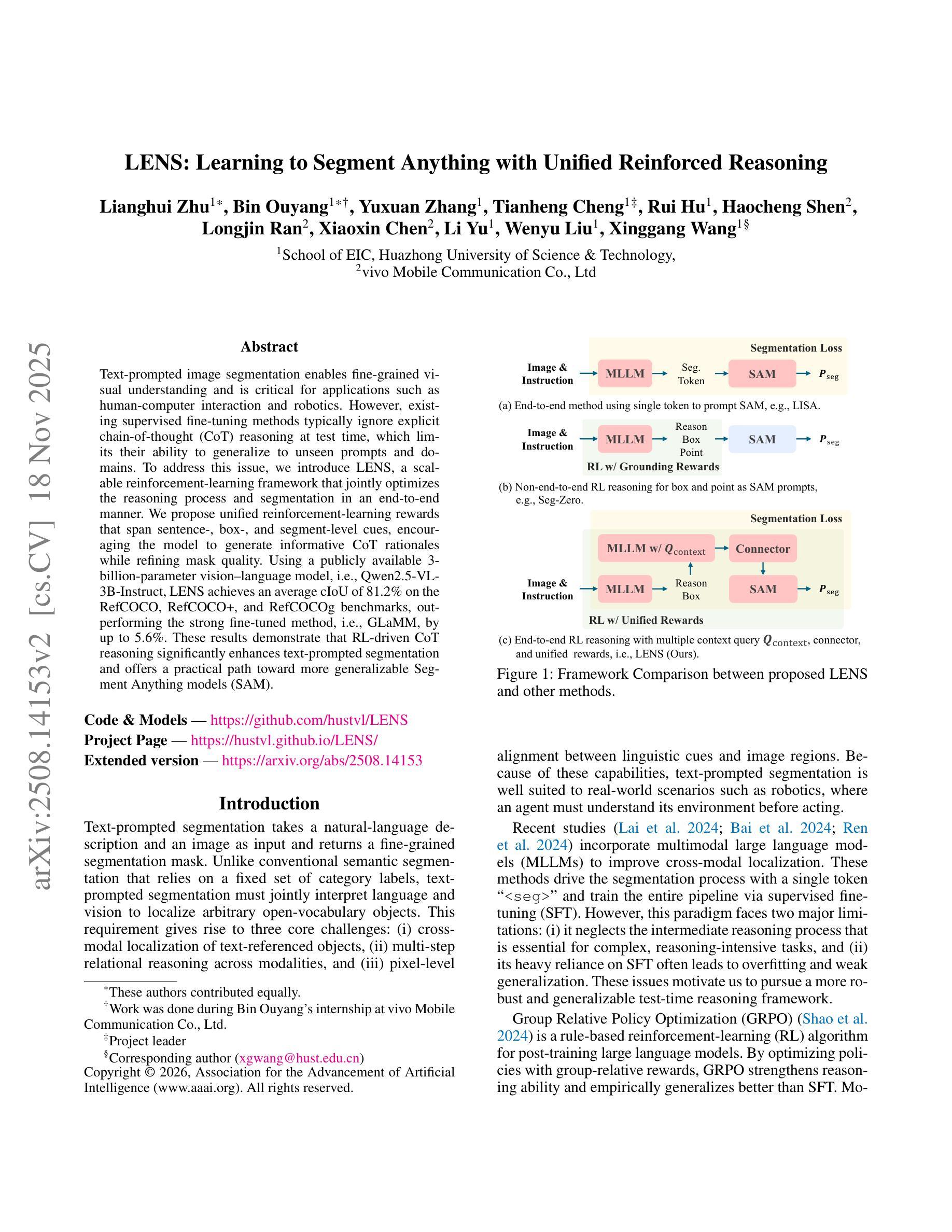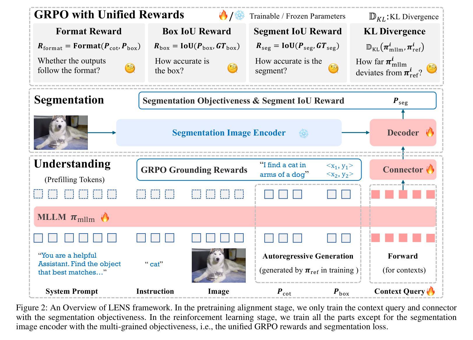 本文提出一种基于强化学习的推理框架LENS,实现了文本提示的图像分割和推理过程的联合优化。LENS采用统一的强化学习奖励机制,涵盖句子、框和分割级别的线索,鼓励模型生成信息丰富的推理理由,同时提高掩模质量。使用公开可用的视觉语言模型Qwen2.5-VL-3B-Instruct,在RefCOCO等多个基准测试中实现了较好的性能提升。