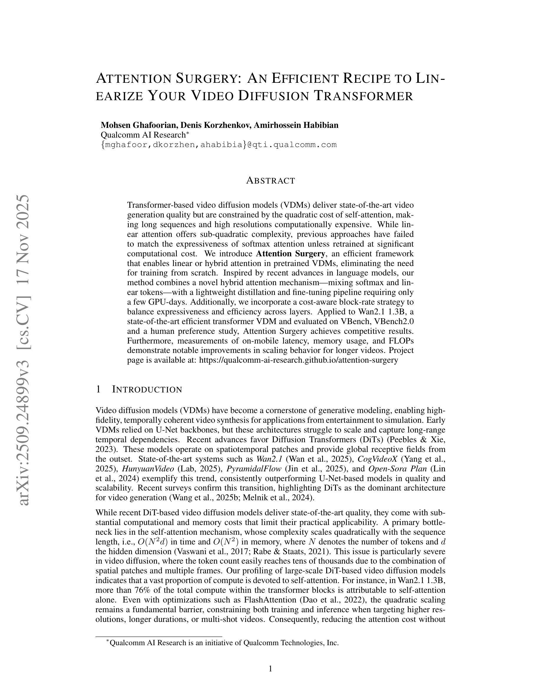 基于Transformer的视频扩散模型(VDM)提供了最先进的视频生成质量,但由于自注意力的二次成本而受到限制,使得长序列和高分辨率的计算成本高昂。虽然线性注意力提供了次二次复杂性,但以前的方法在匹配softmax注意力的表现力方面失败了,除非以重大的计算成本重新训练。我们引入了Attention Surgery,这是一个高效的框架,能够在预训练的VDM中使用线性或混合注意力,无需从头开始训练。我们的方法受到最近语言模型进展的启发,结合了一种新型混合注意力机制——混合softmax和线性令牌——以及一个轻量级的蒸馏和微调管道,只需几天的GPU时间。此外,我们采用了一种成本感知的块率策略,以平衡各层的表现力和效率。应用于Wan2.1 1.3B这一先进的Transformer VDM,并在VBench、VBench2.0和一项人类偏好研究中进行评估,Attention Surgery取得了具有竞争力的结果。此外,对移动端的延迟、内存使用和FLOPs的测量显示,对于较长的视频,其在扩展行为方面有明显的改进。项目页面可在:https://qualcomm-ai-research.github.io/attention-surgery访问。
