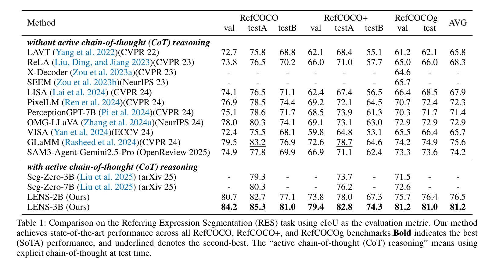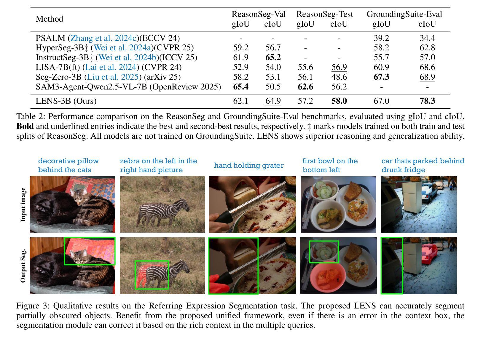 - 使用Qwen2.5-VL-3B-Instruct视觉语言模型,LENS在多个基准测试中实现了平均cIoU为81.2%的性能,超过了精细微调方法GLaMM。