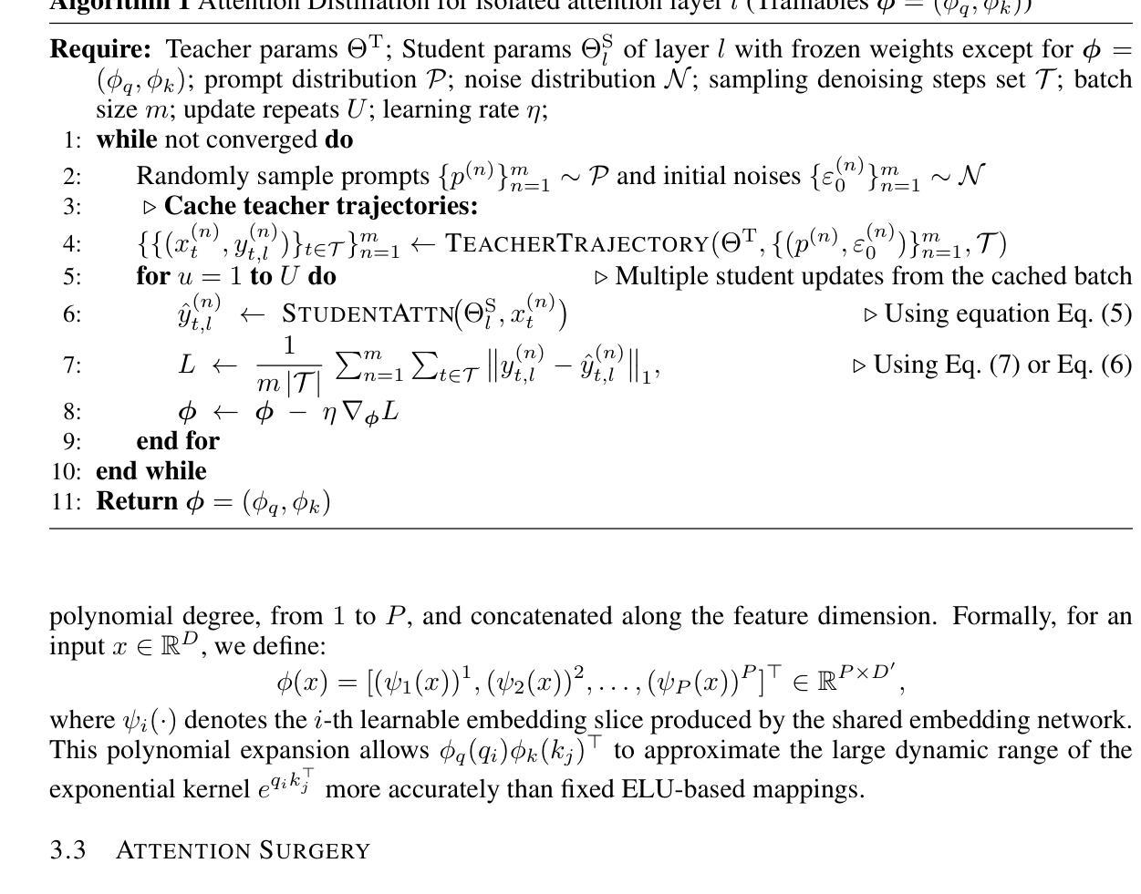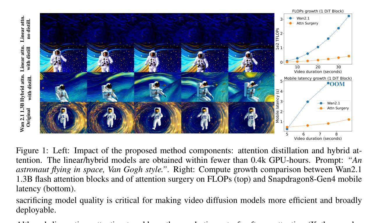 基于Transformer的视频扩散模型(VDM)虽然生成视频质量一流,但由于自注意力的二次成本,处理长序列和高分辨率时计算成本高昂。本研究引入Attention Surgery框架,通过线性或混合注意力,让预训练的VDM无需从头开始训练。该框架结合了混合注意力机制和轻量级蒸馏微调管道,仅需要少量GPU天数。此外,我们还通过成本感知的块率策略来平衡各层的表达性和效率。应用于Wan2.1 1.3B这一高效的Transformer VDM并在VBench等平台上进行评测时,Attention Surgery表现优秀。Attention Surgery还显著提高了移动设备上处理长视频的延迟、内存使用和浮点运算性能。更多信息请访问:https://qualcomm-ai-research.github.io/attention-surgery。