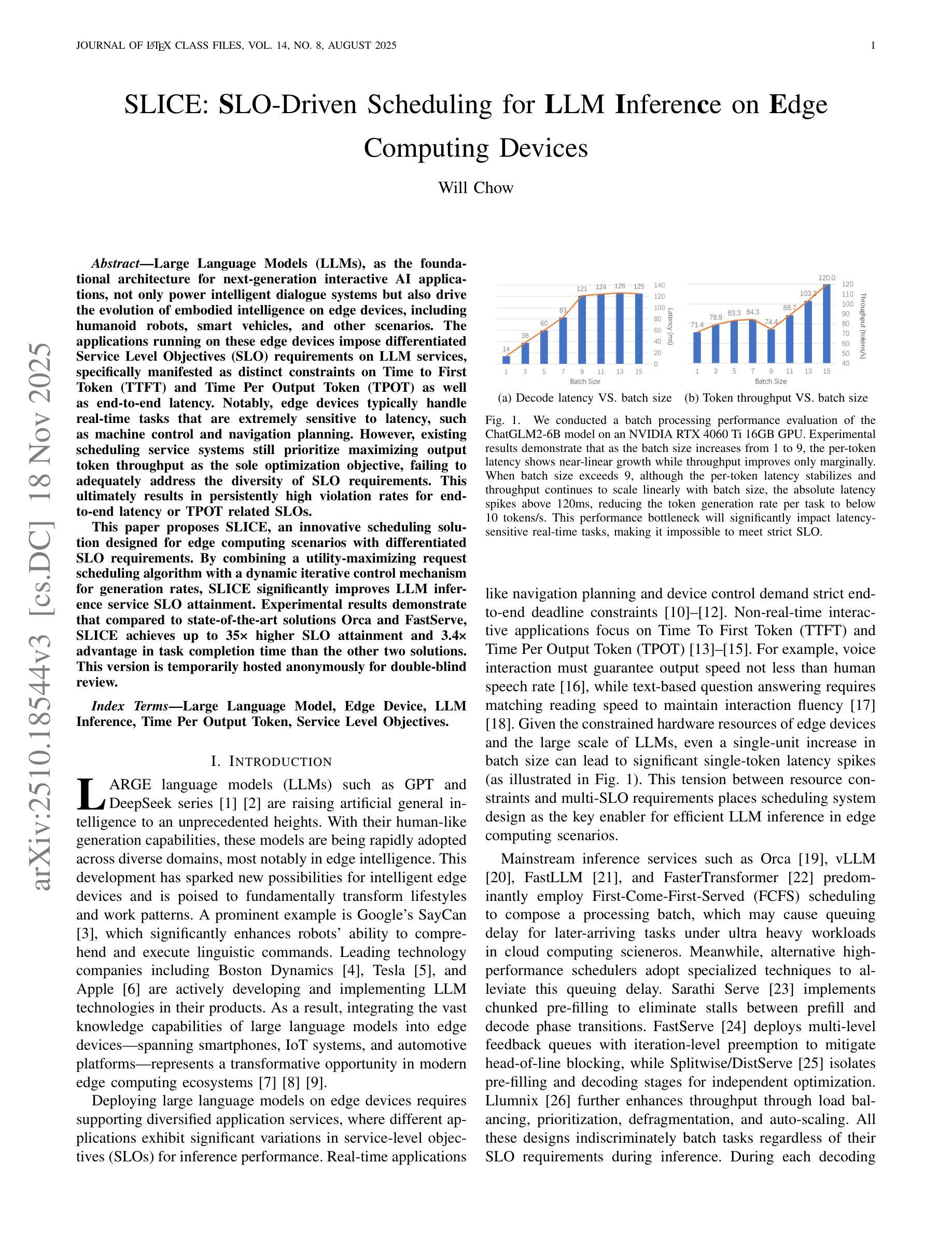 大型语言模型(LLM)作为下一代交互式AI应用的基础架构,不仅助力智能对话系统的发展,还推动边缘设备上的体现智能进化,包括人形机器人、智能车辆和其他场景。在这些边缘设备上运行的应用对LLM服务提出了差异化的服务级别目标(SLO)要求,具体表现为首字节时间(TTFT)、每输出令牌时间(TPOT)以及端到端延迟的不同约束。值得注意的是,边缘设备通常处理对延迟极其敏感的任务,如机器控制和导航规划。然而,现有的调度服务系统仍然将最大化输出令牌吞吐量作为唯一的优化目标,未能充分应对多样化的SLO要求。这最终导致端到端延迟或TPOT相关的SLO持续高违规率。本文提出了一种针对具有差异化SLO要求的边缘计算场景的创新调度解决方案SLICE。通过结合效用最大化请求调度算法和生成速率的动态迭代控制机制,SLICE显著提高了LLM推理服务SLO的达成度。实验结果表明,与最新解决方案Orca和FastServe相比,SLICE的SLO达成度提高了高达35倍,任务完成时间比其他两个解决方案缩短了3.4倍。本版本暂时匿名托管以供双重盲审。