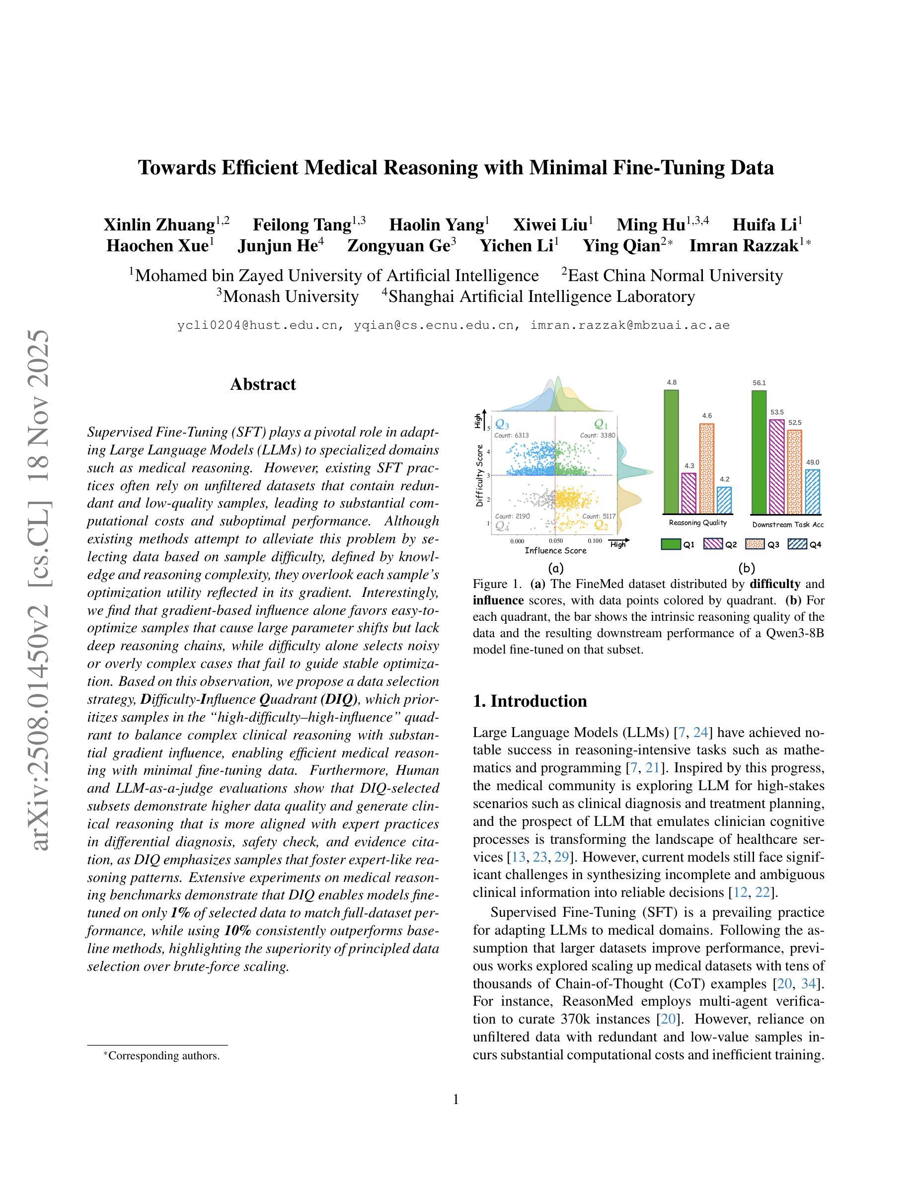 大型语言模型(LLM)在医疗推理等专业领域的应用中,监督微调(SFT)起到关键作用。但现有SFT实践常使用包含冗余和劣质样本的未筛选数据集,导致巨大的计算成本及性能不佳。本文提出一种数据选择策略——难度影响象限(DIQ),优先选取高难度高影响度的样本,平衡复杂临床推理与显著的梯度影响,实现高效的医疗推理并最小化微调数据。经人类和LLM-as-a-judge评估,DIQ选定的子集数据质量更高,生成的临床推理与专家实践更一致。仅在1%的选定数据上进行微调即可达到全数据集的性能,凸显了原则性数据选择优于粗暴的规模扩展。