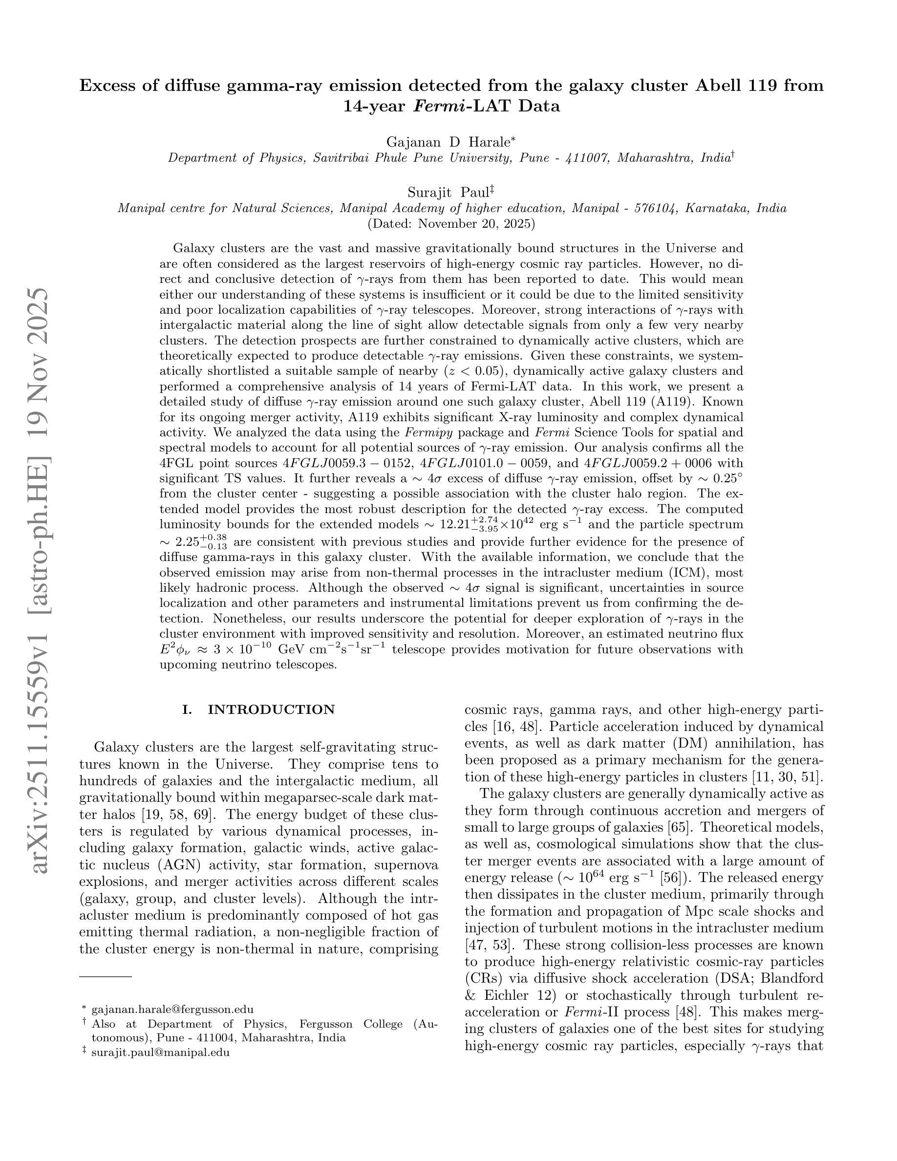 星系团是宇宙中最大的引力束缚系统之一,被认为是高能宇宙射线的主要储存库,然而,至今尚未实现对它们的确定性γ射线检测。这种非检测可能是由于当前γ射线仪器的灵敏度有限和源定位不准确,以及γ射线与中间物质的强烈相互作用,使得可检测到的信号仅限于少数附近的动态活跃星系团。基于这些限制,我们选择了一个邻近(z<0.05)的合并星系团样本,并分析了长达14年的费米LAT数据。在这项工作中,我们对具有显著X射线发光度和复杂动态的合并星系团阿贝尔119(A119)进行了详细研究。使用费米皮和费米科学工具,我们对所有潜在的γ射线源进行了建模,并确认了具有显著TS值的四个FGL点源:FGL J0059.3-0152、FGL J0101.0-0059和FGL J0059.2+0006。它进一步揭示了一个与星系团晕有关,位于星系团中心偏移约$ 0.25^\circ $的$\sim 4σ$漫射γ射线发射过剩。扩展模型提供了最佳拟合,得到的光度约束约为$ 12.21^{+2.74}{-3.95} \times 10^{42} , \text{erg s}^{-1}$,粒子谱指数约为$ 2.25^{+0.38}{-0.13}$,与早期对集群规模非热发射的预期一致。这些结果暗示检测到的信号具有强子起源。尽管$ \sim 4σ $的过剩很令人信服,但定位上的不确定性和仪器上的局限性仍无法确定其检测结果。尽管如此,这些结果突出了对更深层次的集群研究的潜力,估计的中微子流量$ E^{2}φ_ν \approx 3 \times 10^{-10} , \text{GeV cm}^{-2} , \text{s}^{-1} , \text{sr}^{-1}$激励了未来使用即将出现的中微子望远镜进行观测。