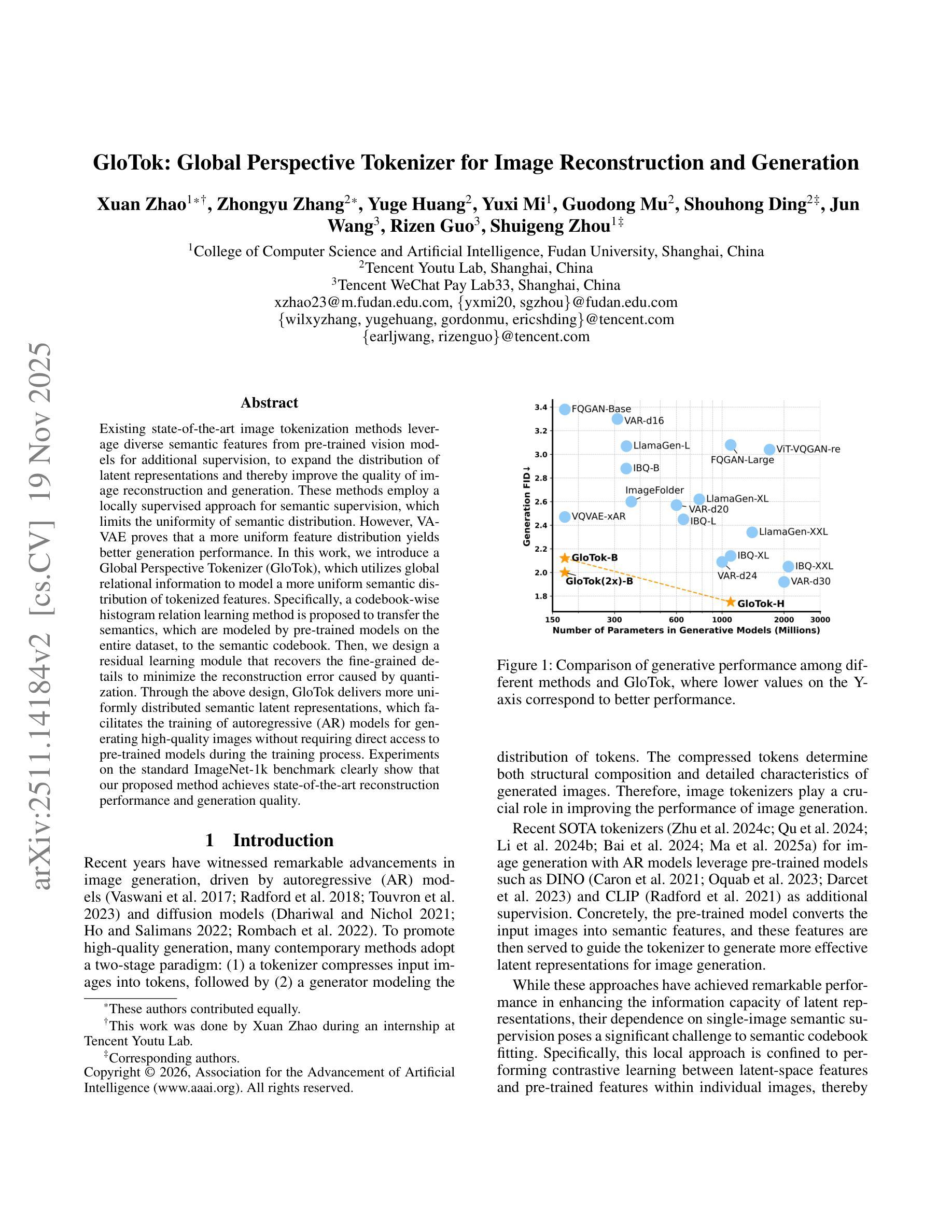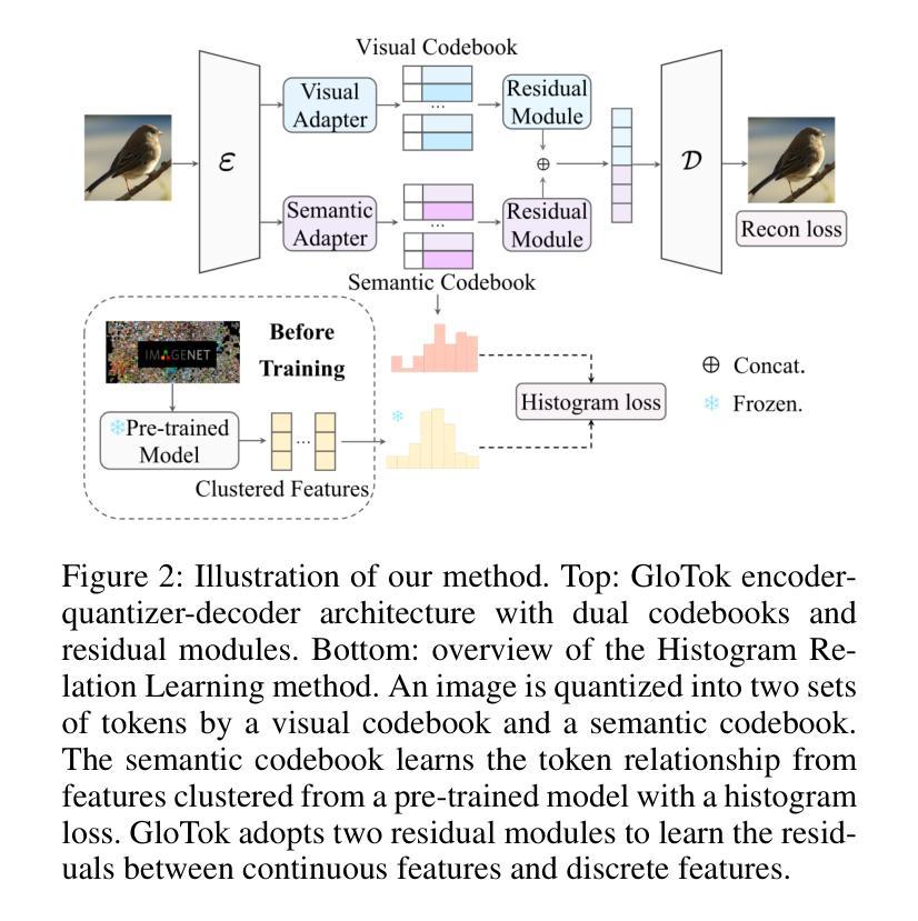 该文介绍了一种全新的全局视角令牌化器(GloTok),它利用全局关系信息来建模更均匀的语义分布特征。该方法通过一种创新的代码本相关直方图关系学习方法,将预训练模型在整个数据集上建模的语义转移到语义代码本中。同时,设计了一个残差学习模块,以恢复细节并最小化量化引起的重建误差。实验证明,GloTok能够在不使用预训练模型的情况下,达到业界领先的重建性能和生成质量。