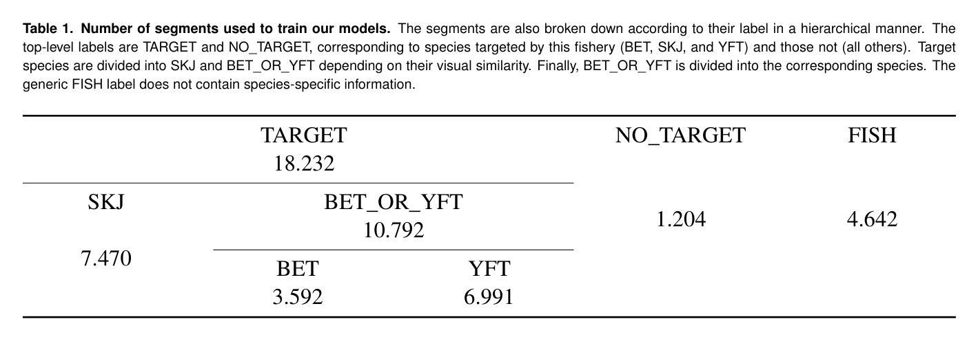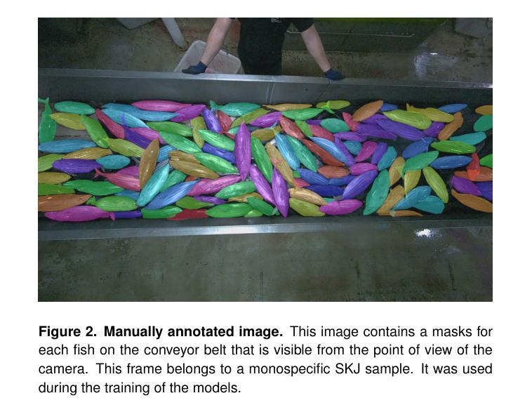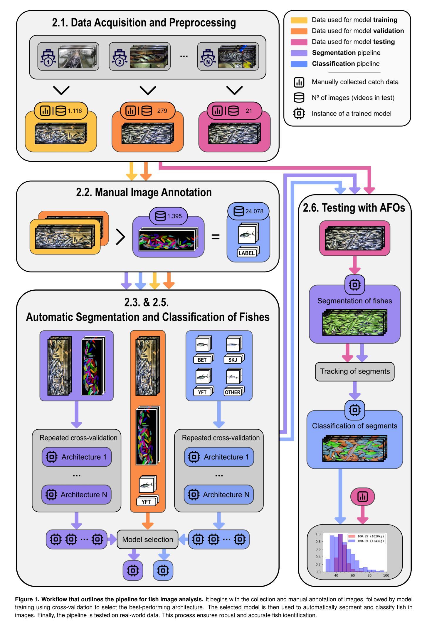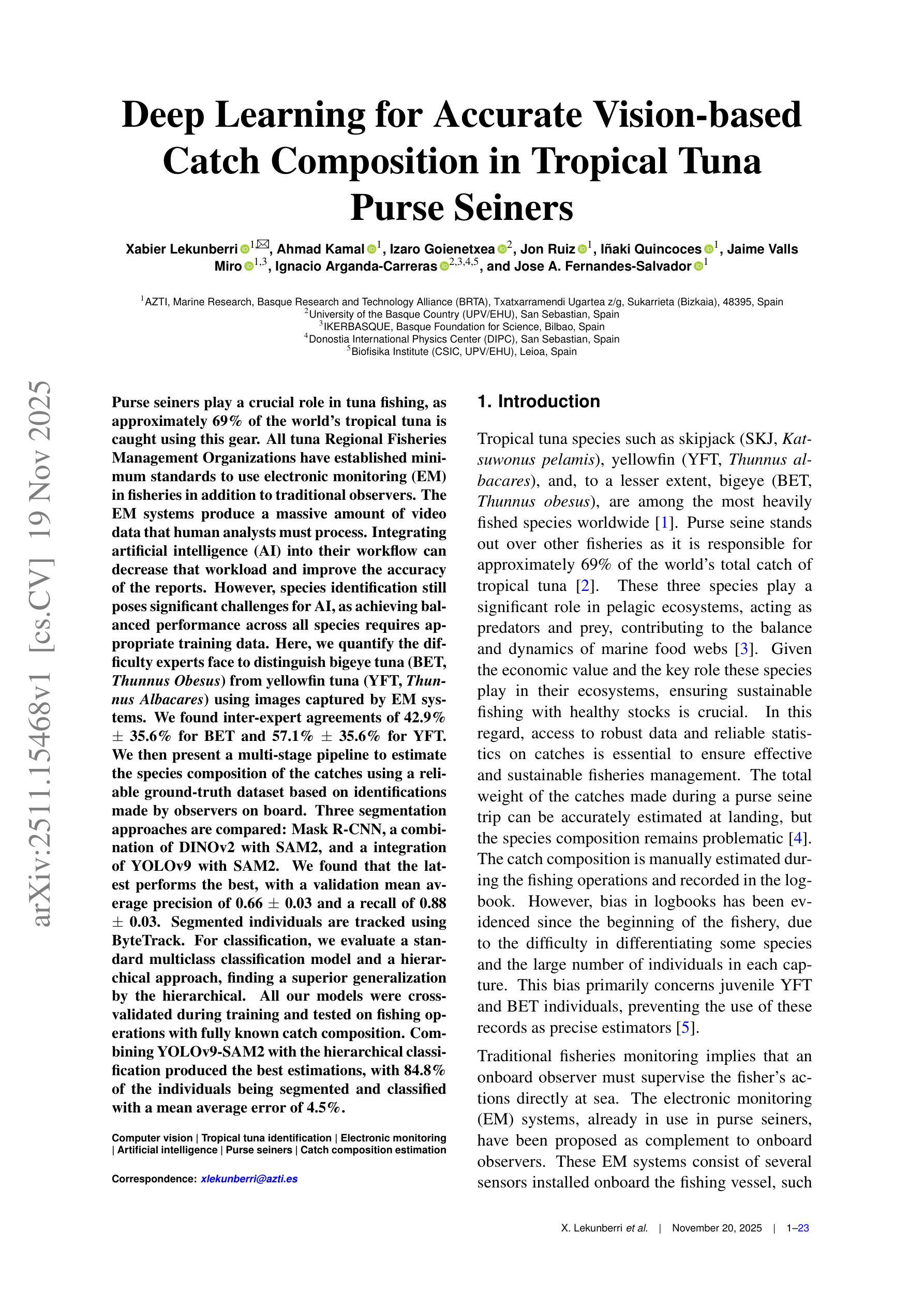 围网在捕捞金枪鱼方面扮演着至关重要的角色,因为全球约69%的热带金枪鱼都是使用这种渔具捕捞的。除了传统观察员外,所有金枪鱼区域渔业管理组织都为渔业制定了使用电子监测(EM)的最低标准。电子监测系统会产生大量的视频数据,需要人类分析师进行处理。将人工智能(AI)集成到他们的工作流程中,可以减少工作量并提高报告准确性。然而,物种识别仍然给人工智能带来了巨大的挑战,因为在所有物种中实现平衡性能需要大量的训练数据。在这里,我们量化专家在使用电子监测系统拍摄的图像来区分大眼金枪鱼(BET,Thunnus Obesus)和黄鳍金枪鱼(YFT,Thunnus Albacares)时的难度。我们发现专家之间对BET的识别一致率为42.9% ± 35.6%,对YFT的识别一致率为57.1% ± 35.6%。然后,我们提出一个多阶段流程来估计捕捞物种组成,该流程基于可靠的地面真实数据集,该数据集基于船上观察员的识别结果。我们比较了三种分割方法:Mask R-CNN、结合DINOv2与SAM2以及YOLOv9与SAM2的集成。我们发现最新方法表现最佳,验证平均精度为0.66 ± 0.03,召回率为0.88 ± 0.03。分割后的个体使用ByteTrack进行跟踪。对于分类,我们评估了标准多类分类模型和分层方法,发现分层方法的泛化性更佳。我们的所有模型在训练过程中都经过了交叉验证,并在捕捞作业上进行了测试,捕捞作业的捕获组成是众所周知的。结合YOLOv9-SAM2与分层分类产生了最佳估算结果,其中84.8%的个体被分割和分类,平均误差为4.5%。
