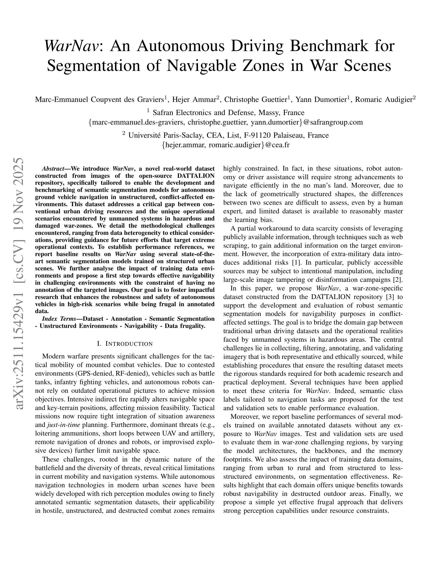我们引入了WarNav数据集,这是一个新的真实世界数据集,通过对开源DATTALION库中的图像进行构建,专门用于开发和评估在结构不良、受冲突影响的环境中自主地面车辆导航的语义分割模型。该数据集解决了传统城市驾驶资源与无人系统在危险和战争破坏区域所面临的独特操作场景之间的关键差距。我们详细介绍了从数据异质性到伦理考量所遇到的方法论挑战,为未来针对极端操作环境的努力提供指导。为了建立性能参考,我们报告了使用几个最新的语义分割模型在结构化城市场景上进行训练后在WarNav上的基线结果。我们还分析了训练数据环境的影响,并提出了在具有挑战性的环境中实现有效导航的第一步,其约束条件是没有目标图像的注释。我们的目标是推动有影响力的研究,提高自主车辆在高风险场景中的稳健性和安全性,同时在标注数据方面保持节俭。