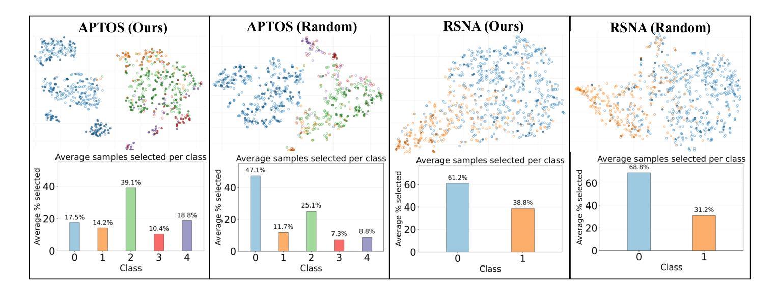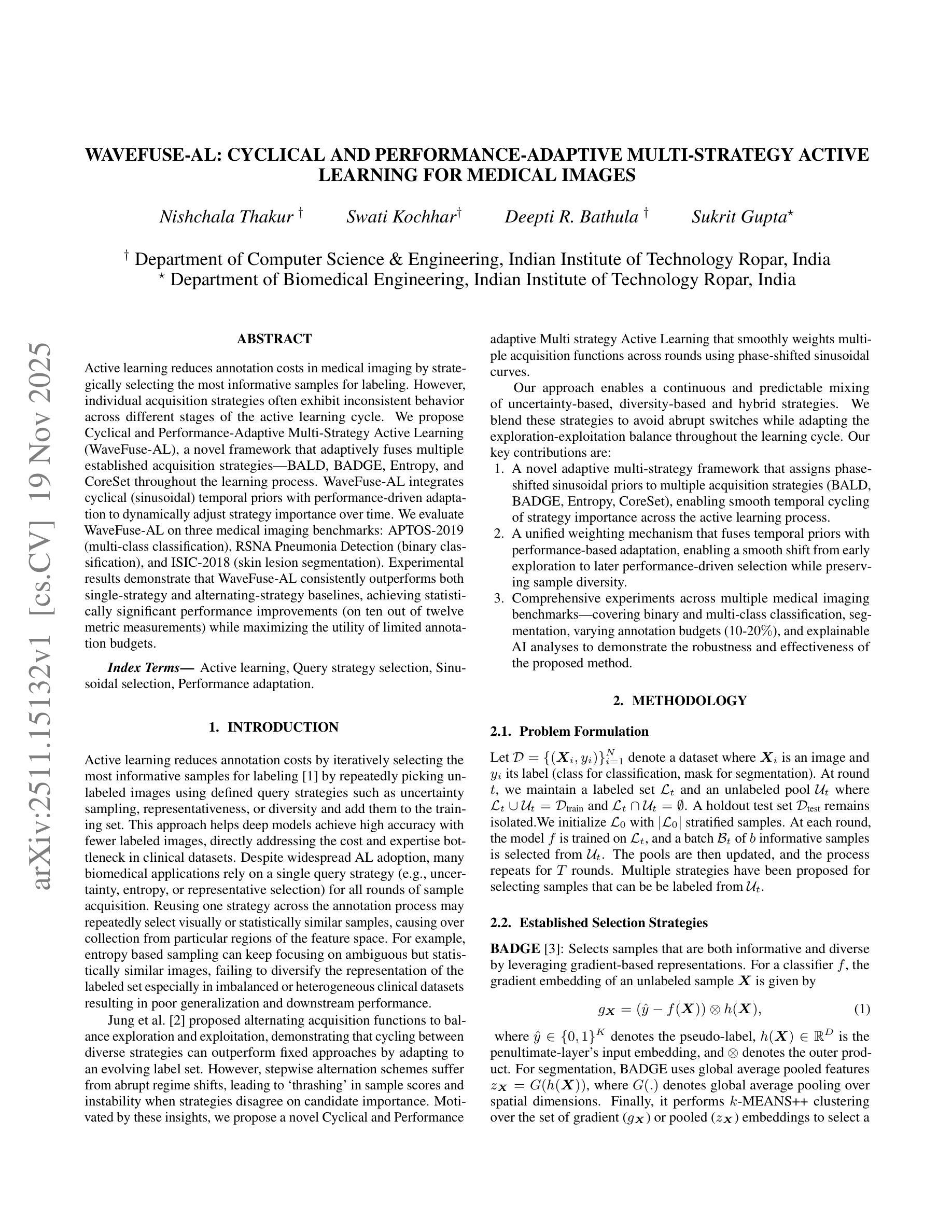 主动学习通过策略性地选择最具信息量的样本进行标注,降低了医学成像的标注成本。然而,不同的主动学习周期阶段,个体获取策略往往表现出不一致的行为。我们提出了循环和性能自适应多策略主动学习(WaveFuse-AL),这是一种新型框架,能够自适应地融合多种已建立的获取策略,包括BALD、BADGE、熵和CoreSet,贯穿学习过程。WaveFuse-AL结合了循环(正弦)时间先验知识和性能驱动的自适应,以随时间动态调整策略的重要性。我们在三个医学成像基准测试上对WaveFuse-AL进行了评估:APTOS-2019(多类分类)、RSNA肺炎检测(二元分类)和ISIC-2018(皮肤病变分割)。实验结果表明,WaveFuse-AL始终优于单策略和交替策略的基线,在12个度量指标中的10个指标上实现了统计上显著的性能提升,同时最大限度地提高了有限标注预算的效用。