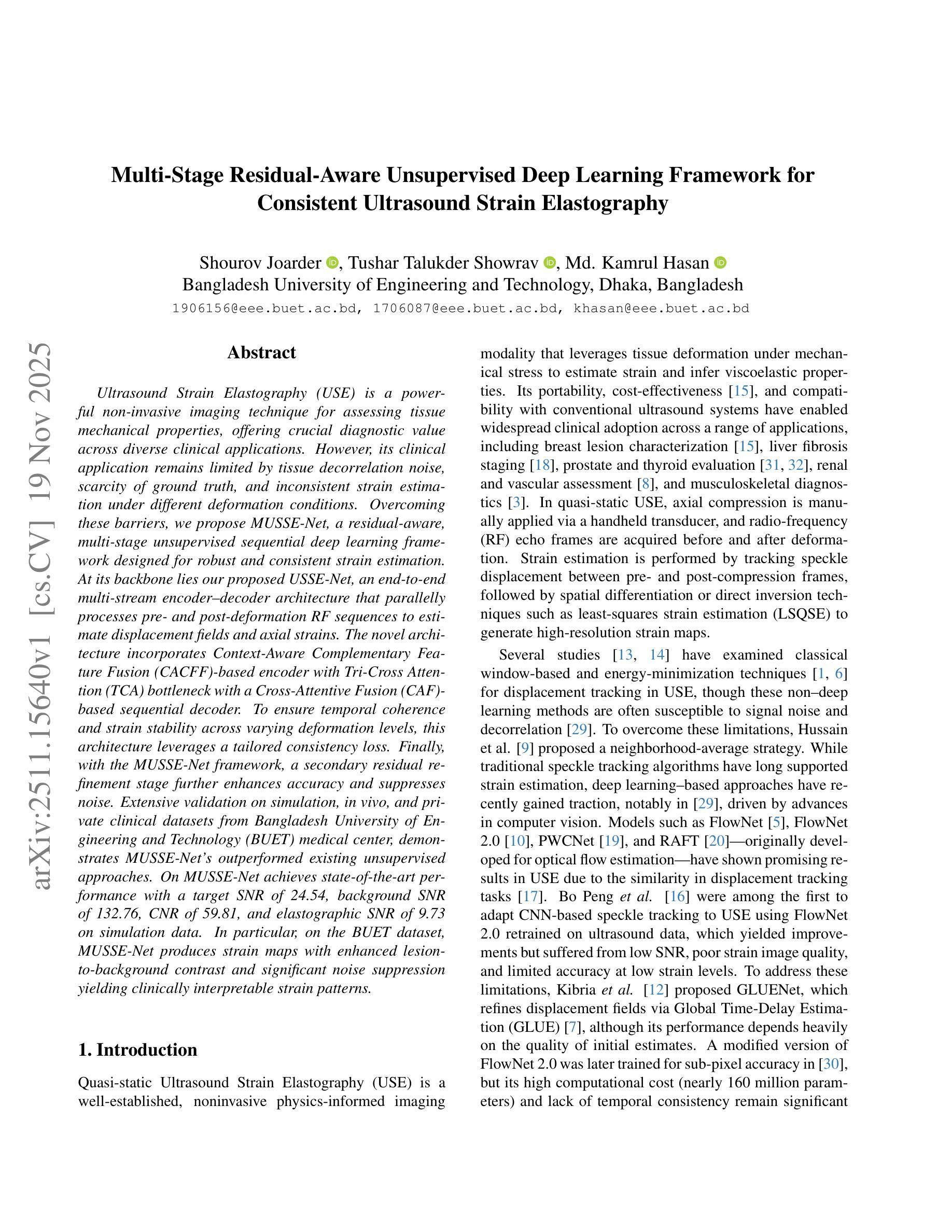 Ultrasound Strain Elastography (USE) is a powerful non-invasive imaging technique for assessing tissue mechanical properties, offering crucial diagnostic value across diverse clinical applications. However, its clinical application remains limited by tissue decorrelation noise, scarcity of ground truth, and inconsistent strain estimation under different deformation conditions. Overcoming these barriers, we propose MUSSE-Net, a residual-aware, multi-stage unsupervised sequential deep learning framework designed for robust and consistent strain estimation. At its backbone lies our proposed USSE-Net, an end-to-end multi-stream encoder-decoder architecture that parallelly processes pre- and post-deformation RF sequences to estimate displacement fields and axial strains. The novel architecture incorporates Context-Aware Complementary Feature Fusion (CACFF)-based encoder with Tri-Cross Attention (TCA) bottleneck with a Cross-Attentive Fusion (CAF)-based sequential decoder. To ensure temporal coherence and strain stability across varying deformation levels, this architecture leverages a tailored consistency loss. Finally, with the MUSSE-Net framework, a secondary residual refinement stage further enhances accuracy and suppresses noise. Extensive validation on simulation, in vivo, and private clinical datasets from Bangladesh University of Engineering and Technology (BUET) medical center, demonstrates MUSSE-Net’s outperformed existing unsupervised approaches. On MUSSE-Net achieves state-of-the-art performance with a target SNR of 24.54, background SNR of 132.76, CNR of 59.81, and elastographic SNR of 9.73 on simulation data. In particular, on the BUET dataset, MUSSE-Net produces strain maps with enhanced lesion-to-background contrast and significant noise suppression yielding clinically interpretable strain patterns.