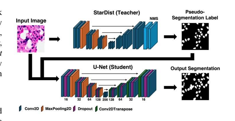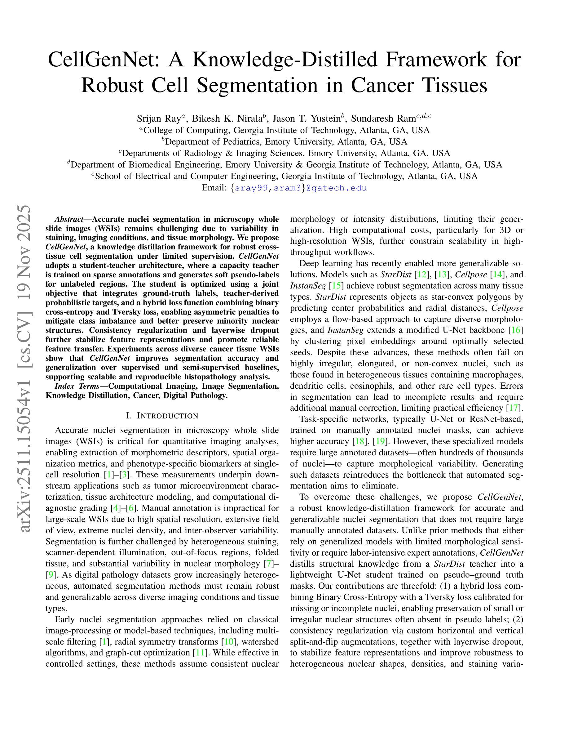 本文提出了CellGenNet,一种基于知识蒸馏的跨组织细胞分割框架,用于在有限的监督条件下实现显微全切片图像(WSIs)中细胞核的精确分割。该框架采用学生-教师架构,通过稀疏注释训练教师模型,为未标记区域生成软伪标签。学生模型使用联合目标进行优化,该目标结合了真实标签、教师生成的概率目标和混合损失函数(包括二元交叉熵和Tversky损失),以缓解类别不平衡问题并更好地保留少数细胞核结构。通过一致性正则化和逐层丢弃策略进一步稳定特征表示并促进可靠的特征转移。实验表明,CellGenNet在多样化的癌症组织WSIs上提高了分割精度和泛化能力,支持可扩展和可重复的组织病理学分析。