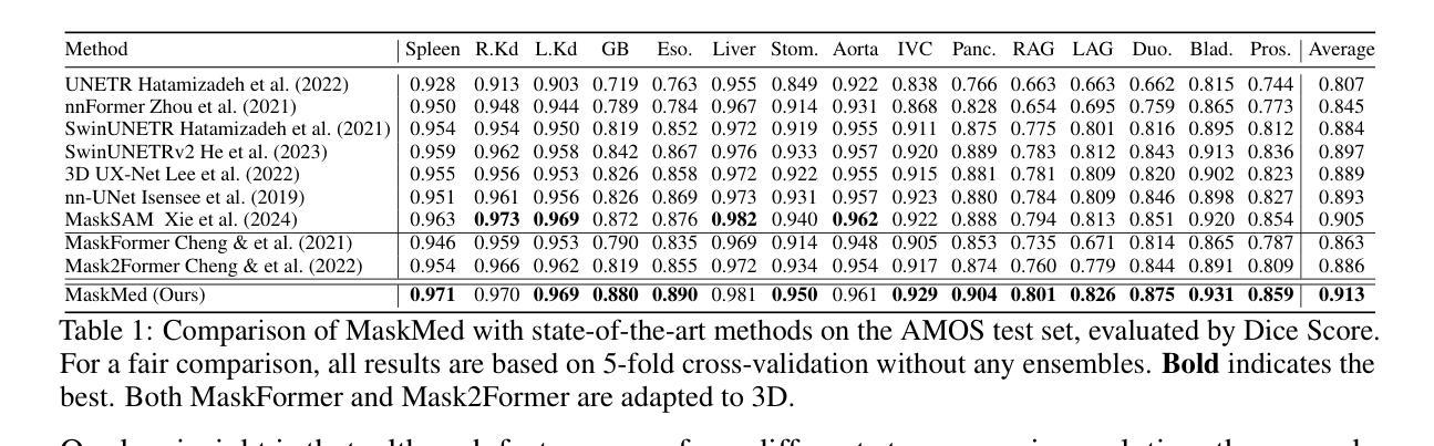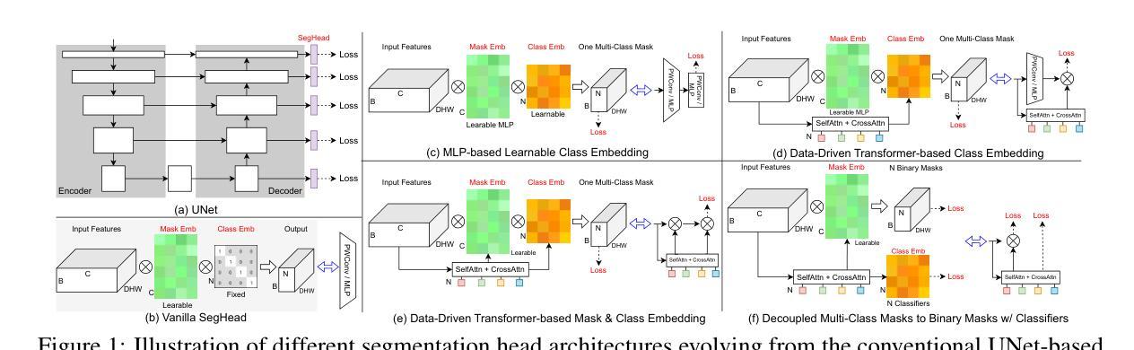 医学图像分割通常采用逐点卷积分割头来预测密集标签,其中每个输出通道都启发式地与特定类别相关联。这种刚性的设计既限制了特征共享也限制了语义泛化。在这项工作中,我们提出了一种统一的解耦分割头,利用共享对象查询将多类别预测分为与类别无关的掩膜预测和类别标签预测。此外,我们引入了一个全尺度可变形Transformer模块,该模块使低分辨率编码器特征能够通过可变形注意力关注全分辨率编码器特征,实现内存高效且空间对齐的全尺度融合。我们提出的方法名为MaskMed,实现了最先进的性能,在AMOS 2022上比nnUNet高出+2.0%的Dice系数,在BTCV上高出+6.9%的Dice系数。