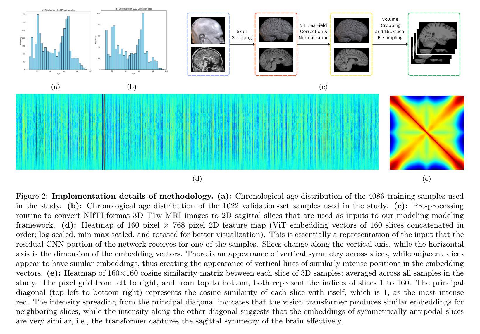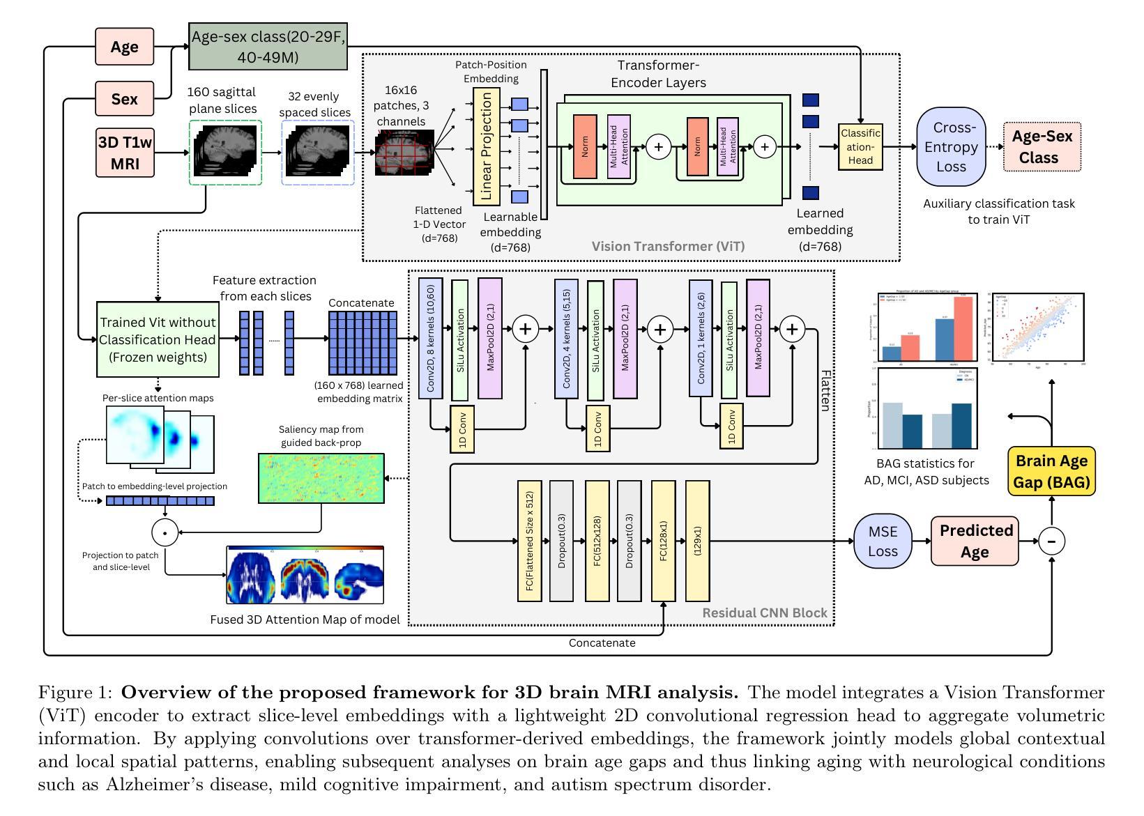 - ViT编码器通过辅助任务学习切片级特征,然后与残差CNN回归器结合,以估计连续的大脑年龄。