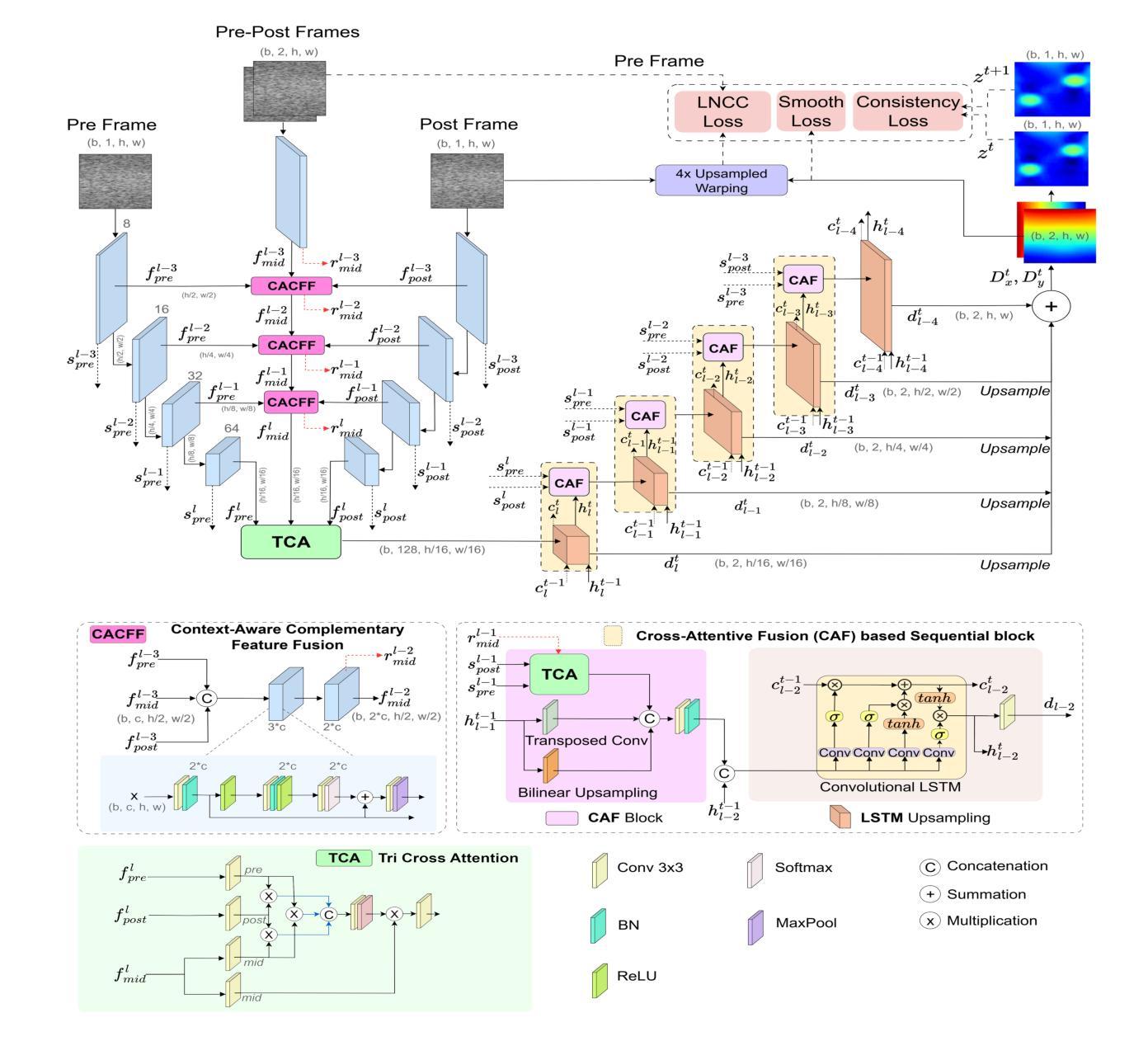 超声应变弹性成像(USE)是一种强大的非侵入性成像技术,用于评估组织的机械特性,在多种临床应用中具有重要的诊断价值。然而,其临床应用仍受到组织去相关噪声、真实数据缺乏和不同变形条件下的应变估计不一致等问题的限制。为了克服这些障碍,我们提出了MUSSE-Net,这是一个剩余感知、多阶段无监督的深度学习框架,旨在实现稳健且一致的应变估计。其核心是我们提出的USSE-Net,这是一种端到端的多元流编码解码器架构,并行处理预变形和后变形射频序列以估计位移场和轴向应变。该新型架构结合了基于上下文感知互补特征融合的编码器与带有三交叉注意力(TCA)瓶颈的交叉注意力融合(CAF)序贯解码器。为了确保不同变形水平的时空一致性和应变稳定性,该架构利用定制的一致性损失。最后,通过MUSSE-Net框架,二次残差细化阶段进一步提高了准确性并抑制了噪声。在模拟、体内以及来自孟加拉国工程技术大学的私人临床数据集上的验证表明,MUSSE-Net超越了现有的无监督方法。在模拟数据上,MUSSE-Net达到了目标信噪比(SNR)为24.54、背景信噪比为132.76、对比度噪声比(CNR)为59.81和弹性成像信噪比为9.73的先进水平性能。特别是在BUET数据集上,MUSSE-Net生成的应变图具有增强的病变与背景对比度以及显著噪声抑制,产生可临床解释的应变模式。