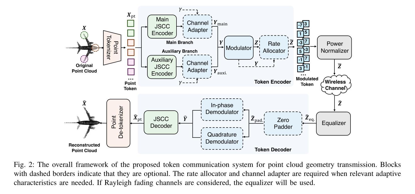 本研究利用Transformer架构研究点云数据的标记(token)通信问题。通过集合抽象方法获取点标记,并提出联合语义通道和调制(JSCCM)方案,将点标记映射为标准数字星座点(调制标记)。该方案包括两个并行Point Transformer编码器、差分调制器以及速率分配器和通道适配器,可自适应生成高质量调制标记。模拟结果表明,该方法在重建上优于联合语义通道编码和传统分离编码,调制符号的压缩比达到6倍以上。