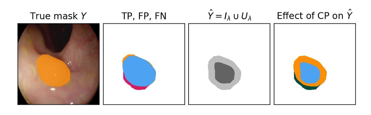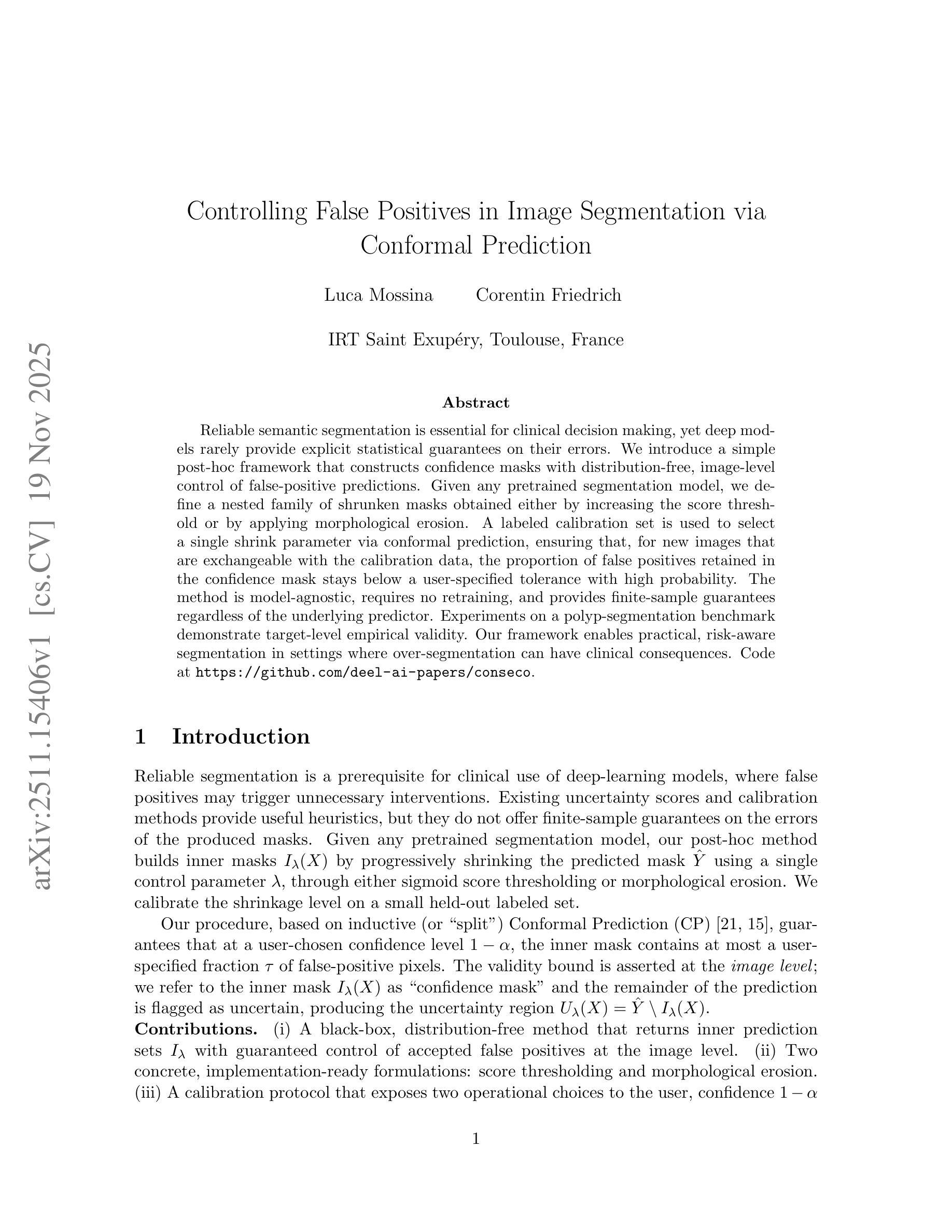 Reliable semantic segmentation is essential for clinical decision making, yet deep models rarely provide explicit statistical guarantees on their errors. We introduce a simple post-hoc framework that constructs confidence masks with distribution-free, image-level control of false-positive predictions. Given any pretrained segmentation model, we define a nested family of shrunken masks obtained either by increasing the score threshold or by applying morphological erosion. A labeled calibration set is used to select a single shrink parameter via conformal prediction, ensuring that, for new images that are exchangeable with the calibration data, the proportion of false positives retained in the confidence mask stays below a user-specified tolerance with high probability. The method is model-agnostic, requires no retraining, and provides finite-sample guarantees regardless of the underlying predictor. Experiments on a polyp-segmentation benchmark demonstrate target-level empirical validity. Our framework enables practical, risk-aware segmentation in settings where over-segmentation can have clinical consequences. Code at https://github.com/deel-ai-papers/conseco.