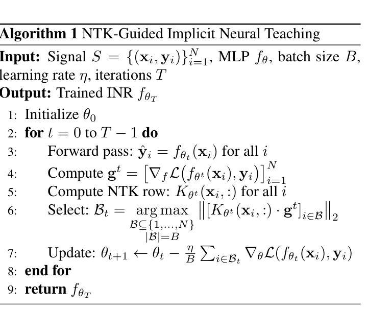 - 提出了NTK引导的隐式神经网络教学方法(NINT),能动态选择最大化全局功能更新的坐标,从而加速训练。