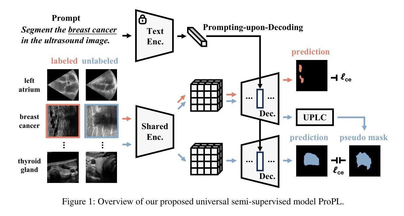 本文提出一种新型的半监督超声图像分割方法ProPL,能同时处理多器官和多任务分割问题,并利用标注和非标注数据。该方法通过共享视觉编码器与提示引导的双解码器实现灵活的任务适应性,并采用基于不确定性驱动伪标签校准的UPLC模块进行可靠自训练。同时引入涵盖5个器官和8个分割任务的全面超声数据集,实验表明ProPL在多种指标上优于现有技术,为通用超声图像分割建立了新基准。
