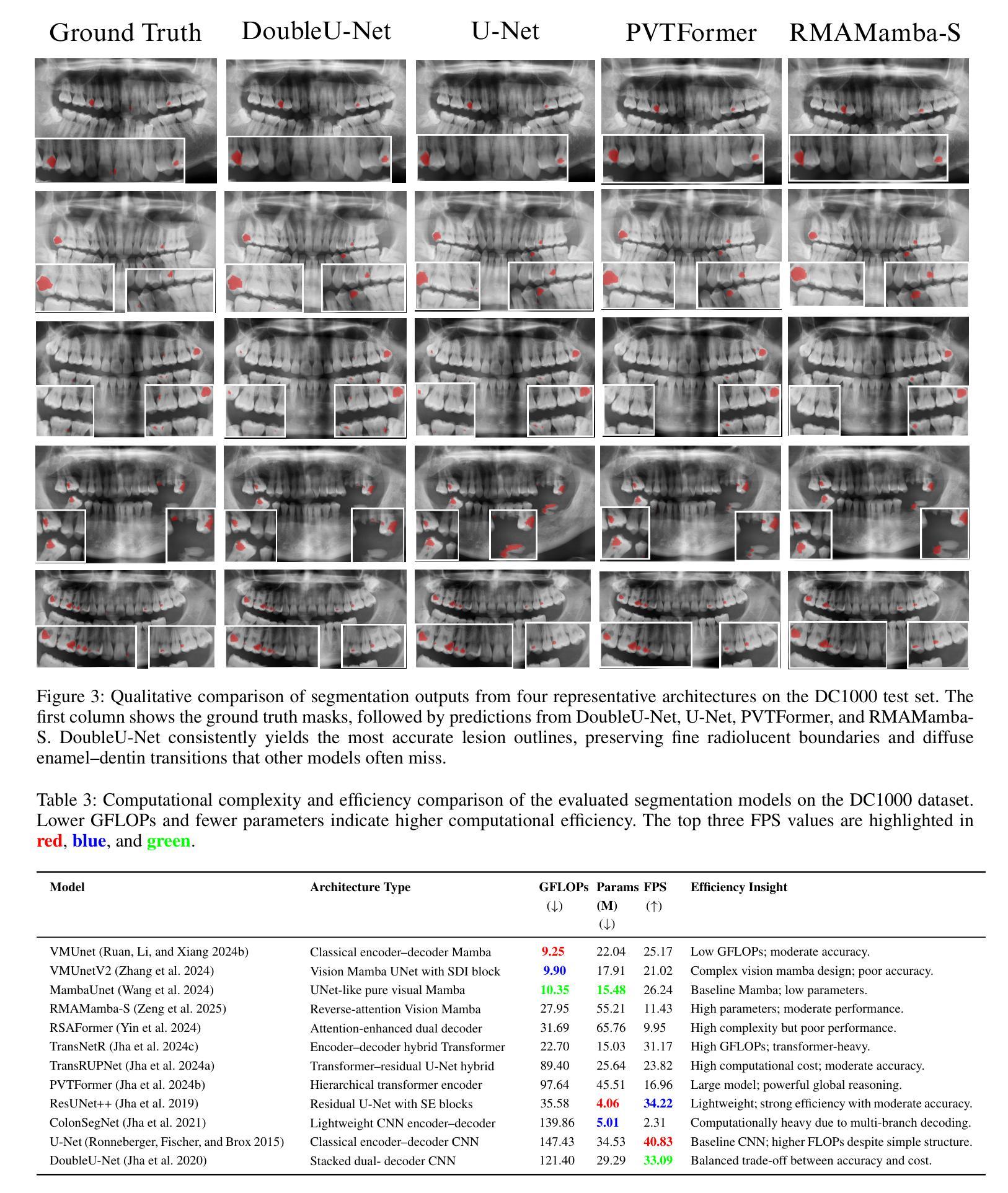 本文研究了全景射片中牙齿龋坏的自动分割问题。通过对DC1000数据集的基准测试,对比了卷积神经网络、视觉变压器和状态空间mamba架构在牙齿龋坏分割上的表现。结果显示,CNN-based的DoubleU-Net表现最佳,其Dice系数达到了0.7345,mIoU为0.5978,精确度达到了0.8145。虽然复杂注意机制架构的趋势日益盛行,但在有限数据和较弱空间先验的条件下,Mamba和基于Transformer的方法表现欠佳。研究结果表明,对于特定领域的医学图像分割任务,模型架构与任务的匹配程度比模型复杂度更重要。