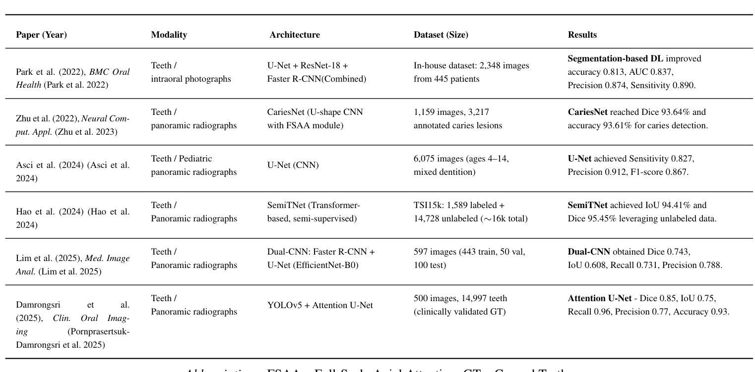 - CNN-based的DoubleU-Net在牙齿龋坏分割任务上表现最佳。