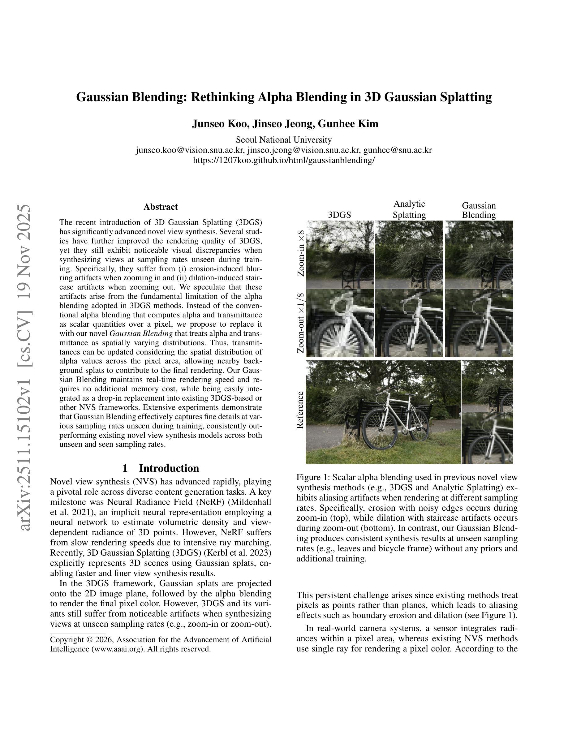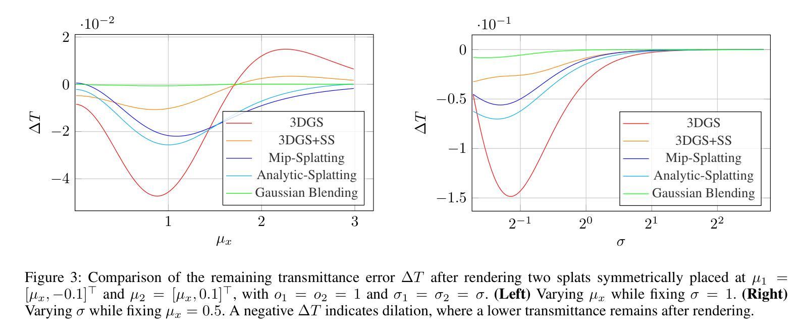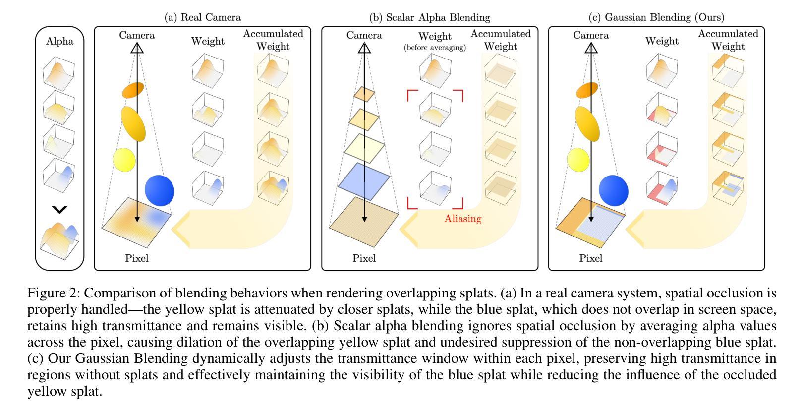 近期引入的3D高斯延展(3DGS)技术极大地推动了新型视图合成的进步。尽管已有若干研究进一步提高了3DGS的渲染质量,但它们仍然展现出合成未见过采样率的视图时明显的视觉差异。具体来说,它们在(i)放大时会出现因侵蚀导致的模糊伪影,以及在(ii)缩小时出现因膨胀导致的阶梯状伪影。我们推测这些伪影源于3DGS方法中使用的alpha混合的基本局限性。我们提出用新型的高斯混合方法取代传统的alpha混合,后者会在像素上计算标量形式的alpha和透射率。我们的高斯混合将alpha和透射率视为空间变化的分布。因此,在考虑像素区域内alpha值的空间分布后,可以更新透射率,允许附近的背景展点有助于最终渲染。我们的高斯混合保持实时渲染速度,无需额外的内存成本,且易于集成到现有的基于3DGS或其他新型视图合成框架中作为插件进行替换。大量实验表明,高斯混合在训练期间未见的各种采样率下有效地捕捉到了细节,并且在未见和已见采样率的情况下均始终优于现有的新型视图合成模型。