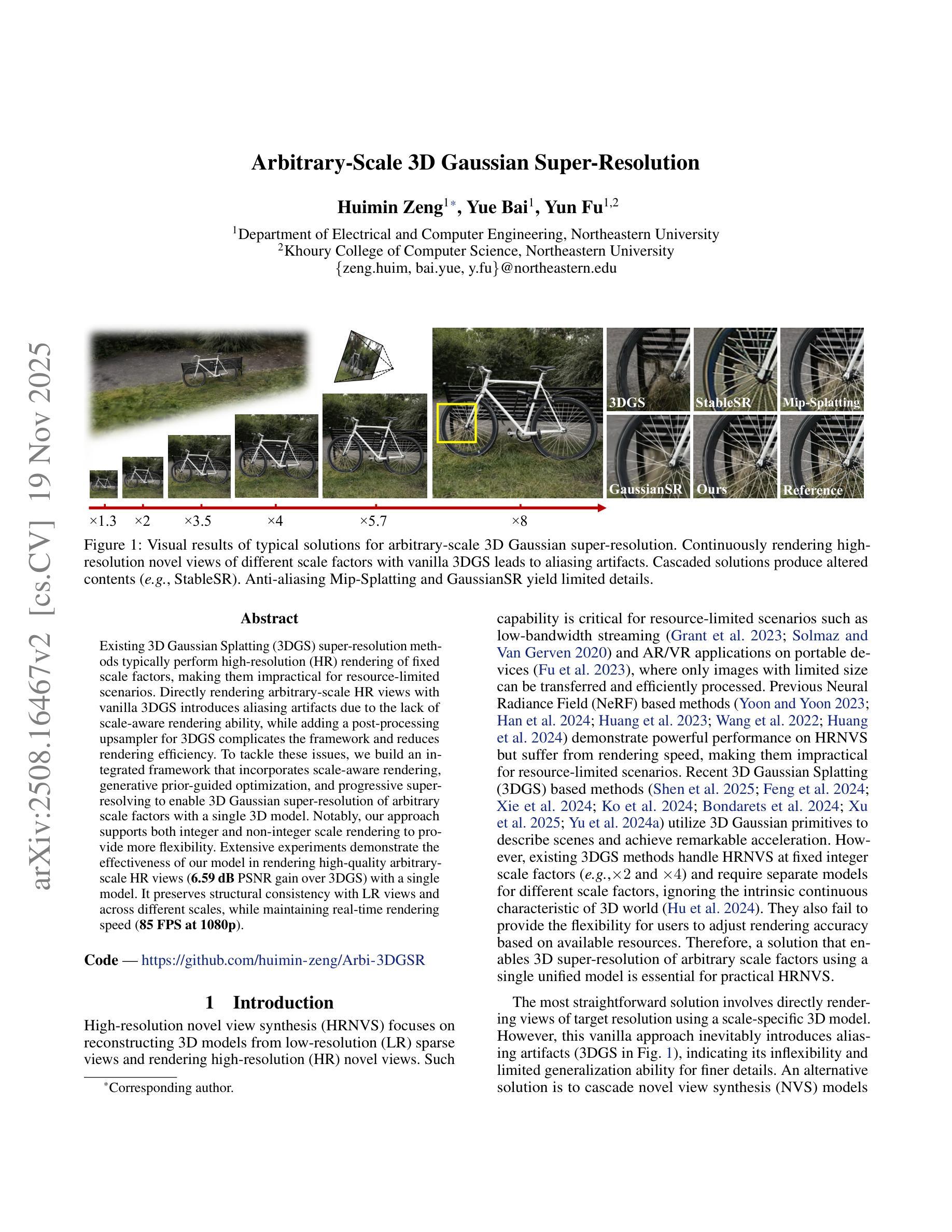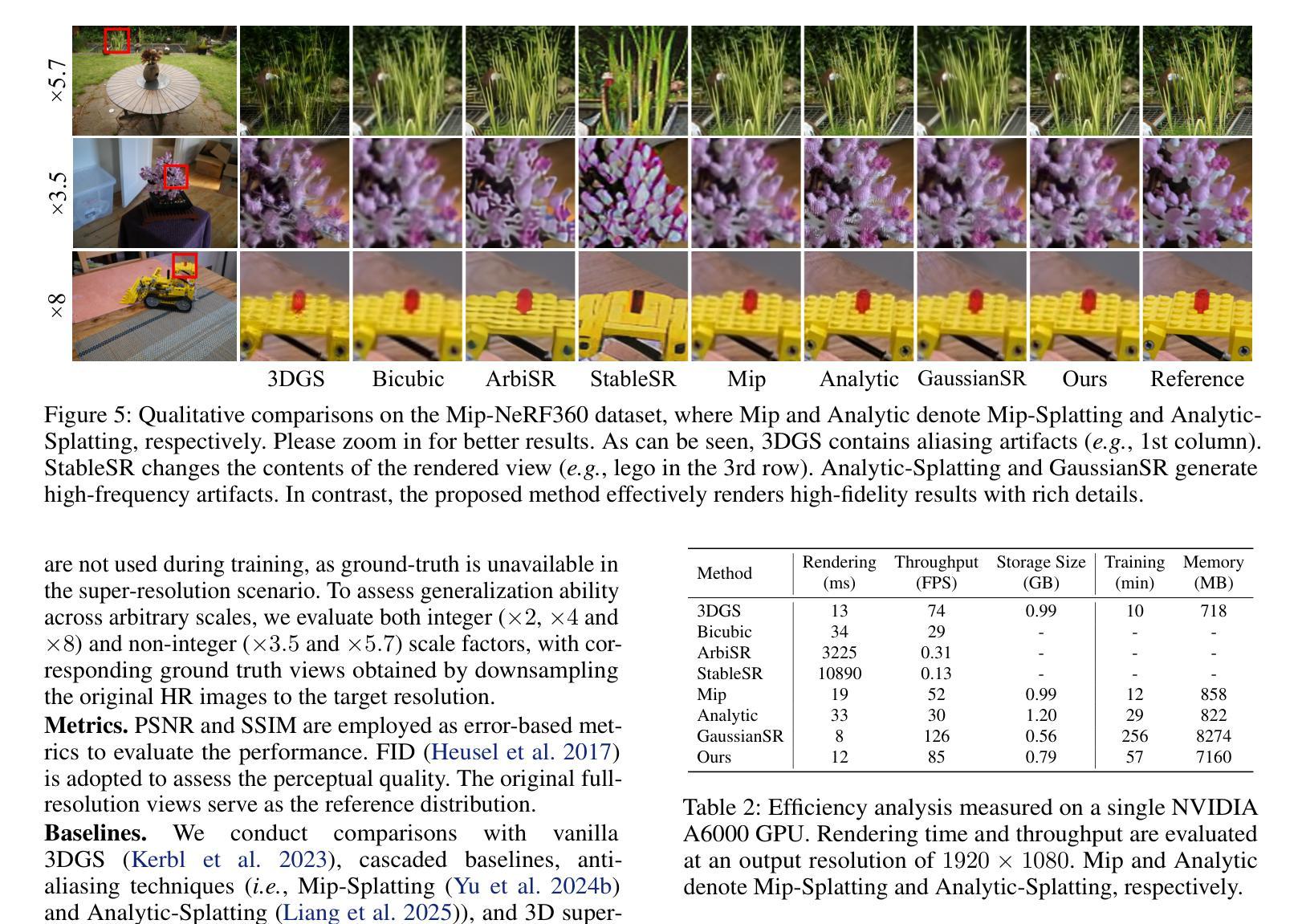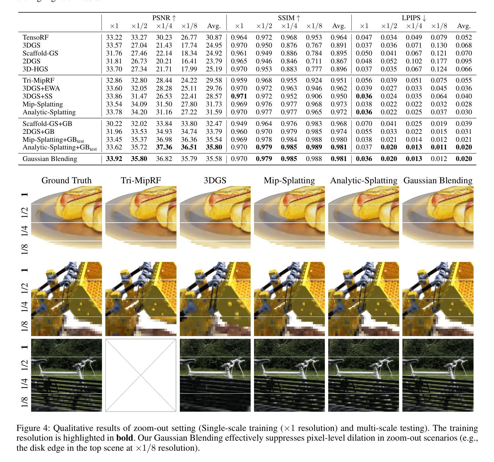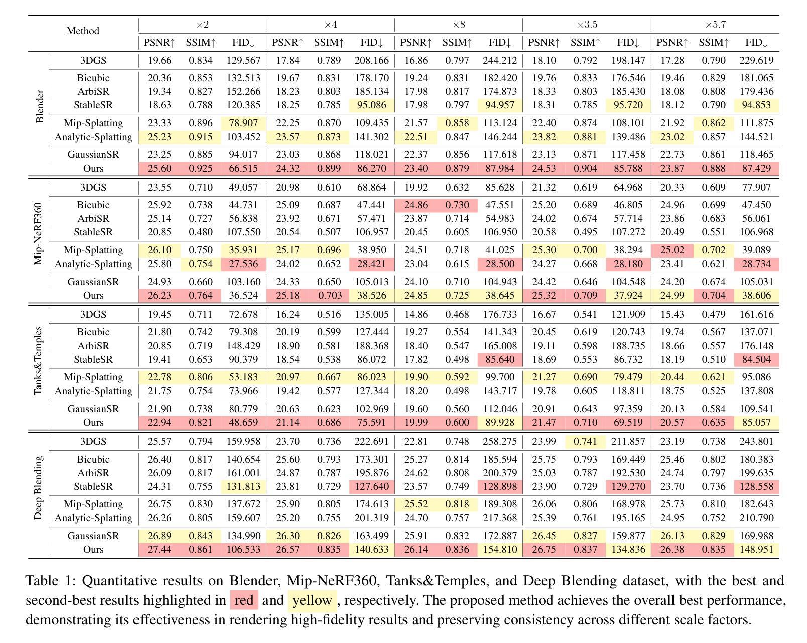 该文针对现有3D高斯混合(3DGS)超分辨率方法存在的问题,提出了一种集成框架,融合了尺度感知渲染、生成先验引导优化和渐进超分辨率技术,实现了单3D模型的任意尺度因子3D高斯超分辨率。该方法支持整数和非整数尺度渲染,提高了渲染质量和灵活性。实验表明,该方法在单模型下实现了高质量任意尺度高分辨率视图渲染,较传统3DGS有6.59 dB PSNR增益,同时保持了实时渲染速度。