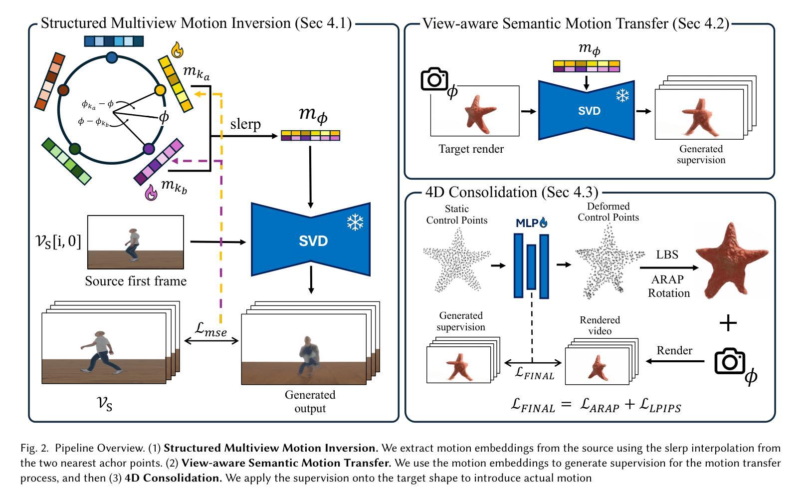 该文提出一种基于高斯分裂技术的全新三维语义动作转移方法,该方法可以从多角度视频中提取动态运动的嵌入信息,并将其应用于静态目标形状的渲染帧上。通过引入锚点视角感知的运动嵌入机制,确保了跨视角的一致性和加速收敛。同时,该文还建立了一个针对语义三维动作转移的首个基准测试集,并展示了相较于其他基线方法更高的动作保真度和结构一致性。