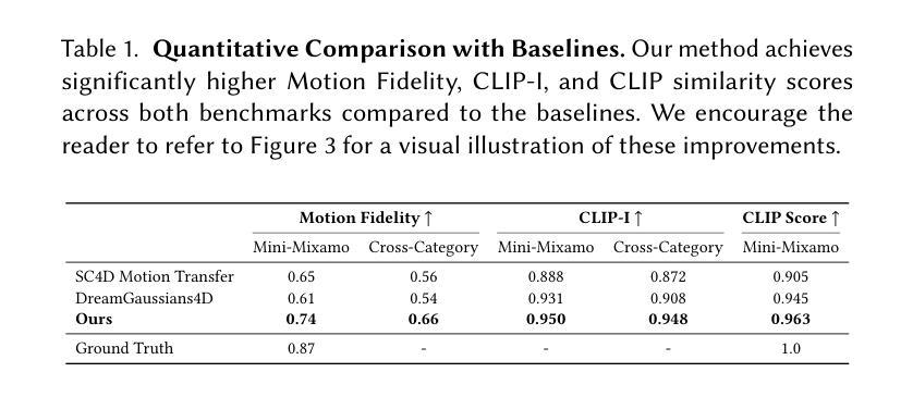 - 与适应的基线相比,该方法展示更高的动作保真度和结构一致性。