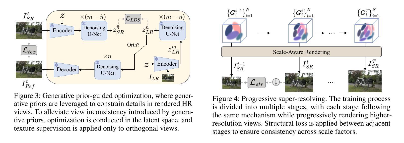 - 提出的集成框架融合了尺度感知渲染、生成先验引导优化和渐进超分辨率技术。