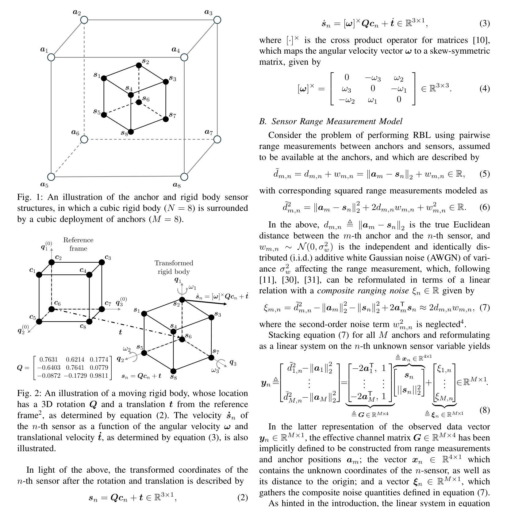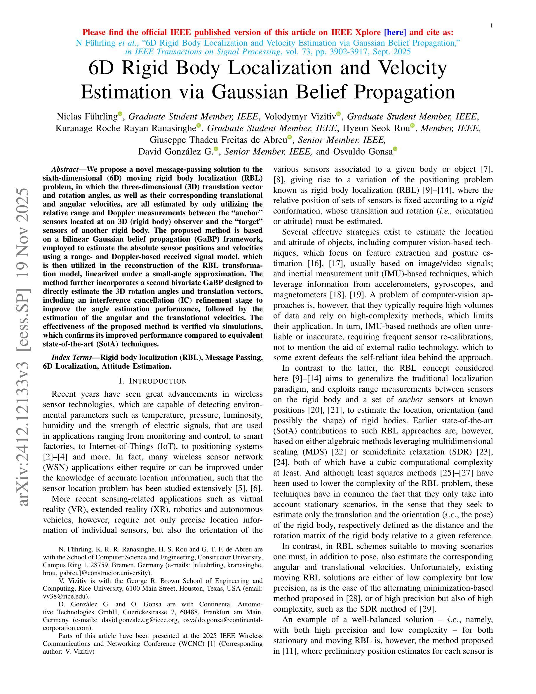 本文提出一种新型消息传递算法解决六维空间中的动态刚体定位问题,利用相对测距和多普雷达测量估计三维平移向量和旋转角度以及对应的速度和角速度。该方法基于双线性高斯信念传播算法框架,利用测距和多普雷达接收信号模型估计绝对传感器位置和速度,并重建在小角度近似下线性化的刚体定位转换模型。该方法还包含第二个双变量高斯信念传播算法,用于直接估计三维旋转角度和平移向量,并采用干扰消除细化阶段以提高角度估计性能,最终完成速度和角速度的估计。模拟验证显示此方法较当前先进技术的性能有所提升。