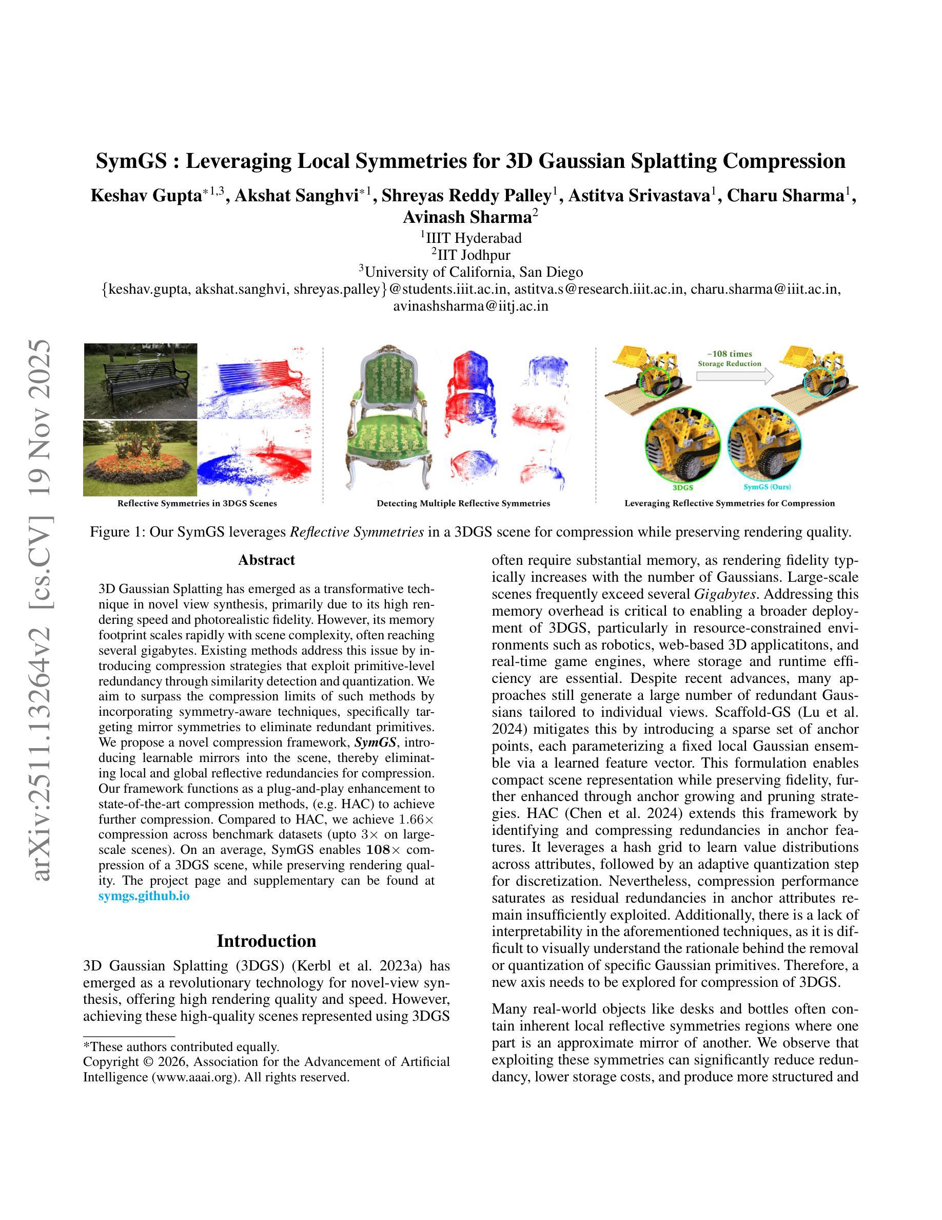 3D Gaussian Splatting在新型视图合成中展现出了变革性的技术,以其高渲染速度和逼真的画质著称。但其内存占用随着场景复杂度快速增加,达到数GB。现有方法通过引入压缩策略解决这一问题,利用基本单元的冗余性进行相似性检测和量化。我们的目标是超越此类方法的压缩极限,通过融入对称性感知技术,特别是针对镜像对称性消除冗余基本单元。我们提出了一种新型压缩框架SymGS,引入可学习镜像至场景,从而消除局部和全局反射冗余以实现压缩。该框架可作为最先进的压缩方法的插件进行增强(如HAC),以实现更高的压缩效果。相比HAC,我们在基准数据集上实现了1.66倍的压缩(大规模场景上最高可达3倍)。平均而言,SymGS实现了3DGS场景的108倍压缩,同时保持渲染质量。
