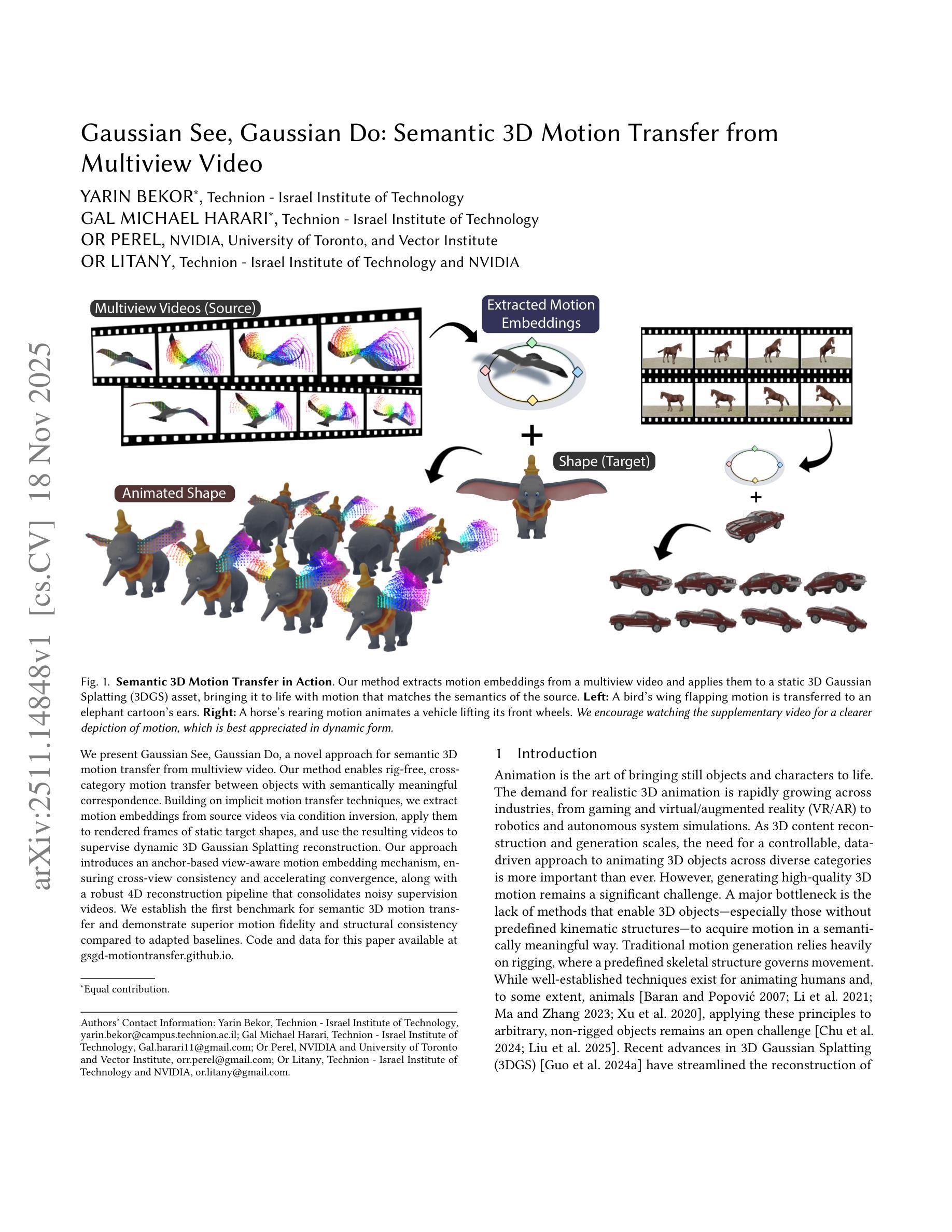 我们提出了一种新的方法——Gaussian See和Gaussian Do,用于从多视角视频进行语义3D动作迁移。我们的方法能够实现无骨架、跨类别的对象间语义对应的动作迁移。我们基于隐式动作迁移技术,通过条件反转从源视频中抽取动作嵌入信息,将其应用于静态目标形状的渲染帧,并使用所得视频来监督动态3D高斯贴图重建。我们的方法引入了一种基于锚点的视角感知动作嵌入机制,确保跨视角的一致性并加速收敛,同时建立一个稳健的4D重建流程来整合噪声监督视频。我们建立了第一个语义3D动作迁移的基准测试,并展示了相比于适应性基准的高超动作保真度和结构一致性。这篇论文的代码和数据可在https://gsgd-motiontransfer.github.io/找到。