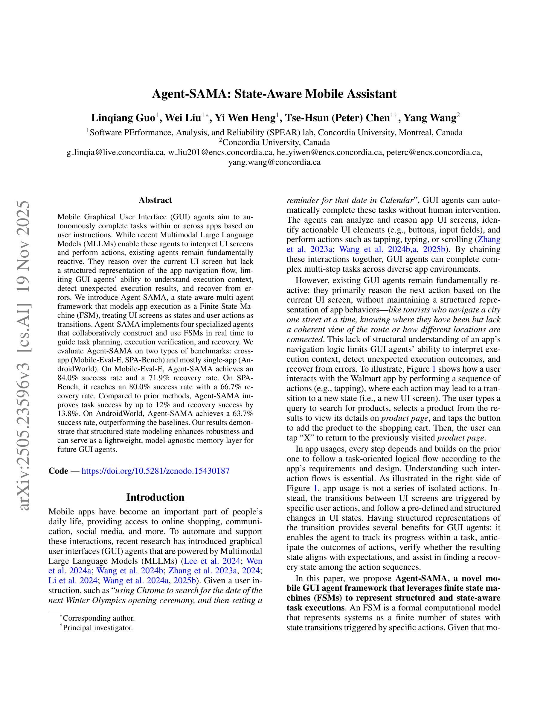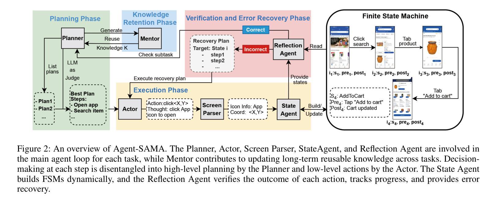 移动图形用户界面(GUI)代理旨在根据用户指令在应用程序内部或跨应用程序自主完成任务。虽然最近的多媒体语言模型(MLLMs)允许这些代理解释UI屏幕并执行操作,但现有代理仍然基本上是反应式的。它们在当前的UI屏幕上进行推理,但缺乏应用程序导航流的结构化表示,这限制了GUI代理理解执行上下文、检测意外的执行结果并从错误中恢复的能力。我们引入了Agent-SAMA,一个状态感知的多代理框架,它将应用程序的执行建模为有限状态机(FSM),将UI屏幕视为状态,用户操作视为转换。Agent-SAMA实现了四个专业代理,它们协同实时构建和使用FSM,以指导任务规划、执行验证和恢复。我们在两种类型的基准测试上评估了Agent-SAMA:跨应用程序(Mobile-Eval-E,SPA-Bench)和主要是单应用程序(AndroidWorld)。在Mobile-Eval-E上,Agent-SAMA达到了84.0%的成功率和71.9%的恢复率。在SPA-Bench上,其成功率达到80.0%,恢复率为66.7%。与先前的方法相比,Agent-SAMA的任务成功率提高了高达12%,恢复成功率提高了13.8%。在AndroidWorld上,Agent-SAMA达到了63.7%的成功率,超越了基线。我们的结果表明,结构化状态建模提高了稳健性,并可以作为未来GUI代理的轻量级、模型无关的记忆层。