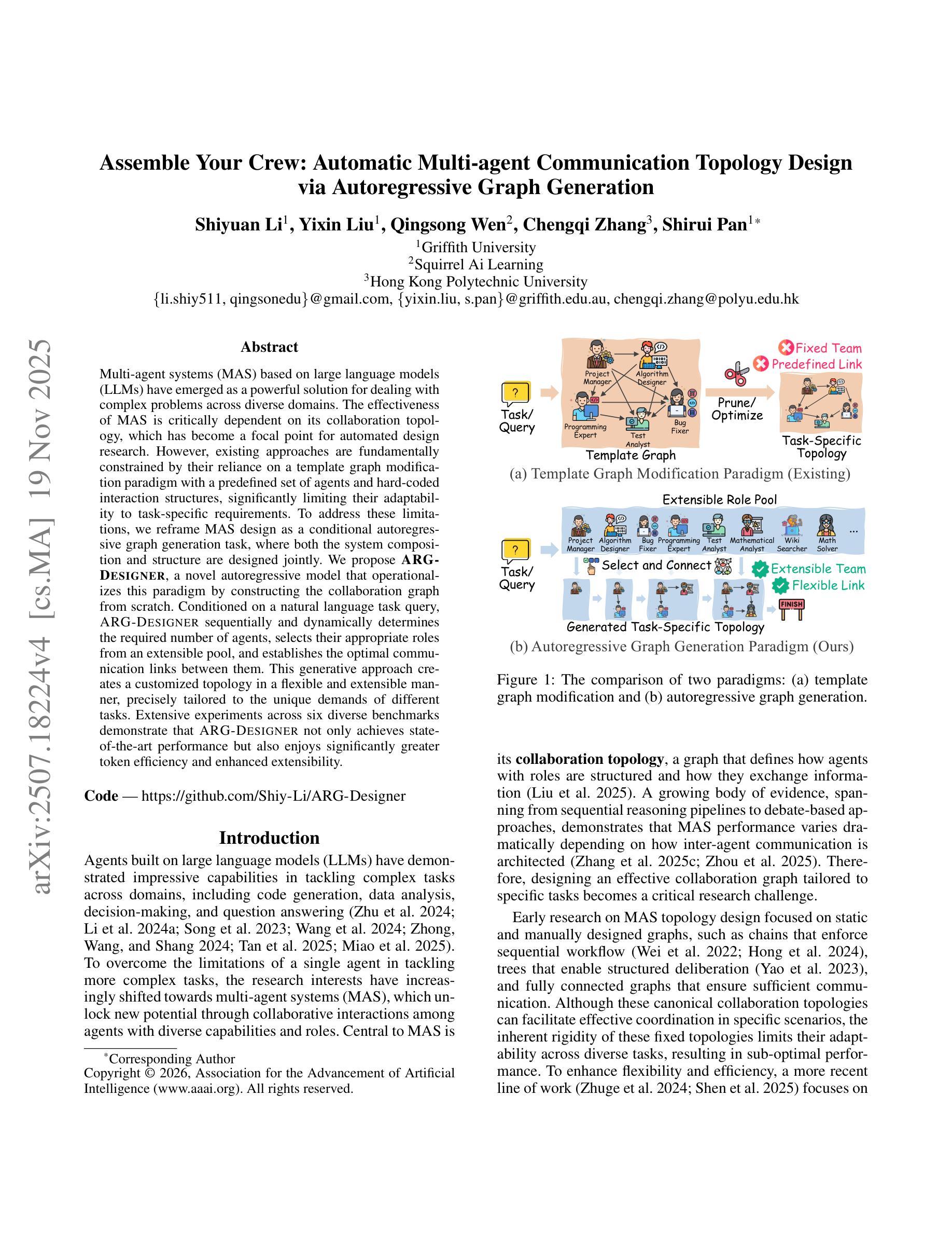 基于大型语言模型(LLM)的多智能体系统(MAS)已作为处理跨不同领域的复杂问题的强大解决方案而出现。MAS的有效性严重依赖于其协作拓扑结构,这已成为自动设计研究的一个重点。然而,现有方法从根本上受到其依赖于模板图修改范式的约束,具有预定义的智能体集合和硬编码的交互结构,这对于特定任务的特定要求适应能力较弱。为了解决这个问题,我们重新设计了MAS设计为一种条件自回归图生成任务,其中系统组成和结构是共同设计的。我们提出了ARG-Designer,这是一种新型的自回归模型,它通过从零开始构建协作图来实现这一范式。基于自然语言任务查询,ARG-Designer可以顺序地动态地确定所需智能体的数量,从可扩展的智能体池中为它们选择适当的角色并建立最佳的通信链接。这种生成式方法为不同的任务创建定制的拓扑结构,以灵活和可扩展的方式精确匹配不同的需求。在六个不同基准测试上的大量实验表明,ARG-Designer不仅达到了最先进的性能,而且在令牌效率和扩展性方面也有显著提高。ARG-Designer的源代码可在https://github.com/Shiy-Li/ARG-Designer获取。