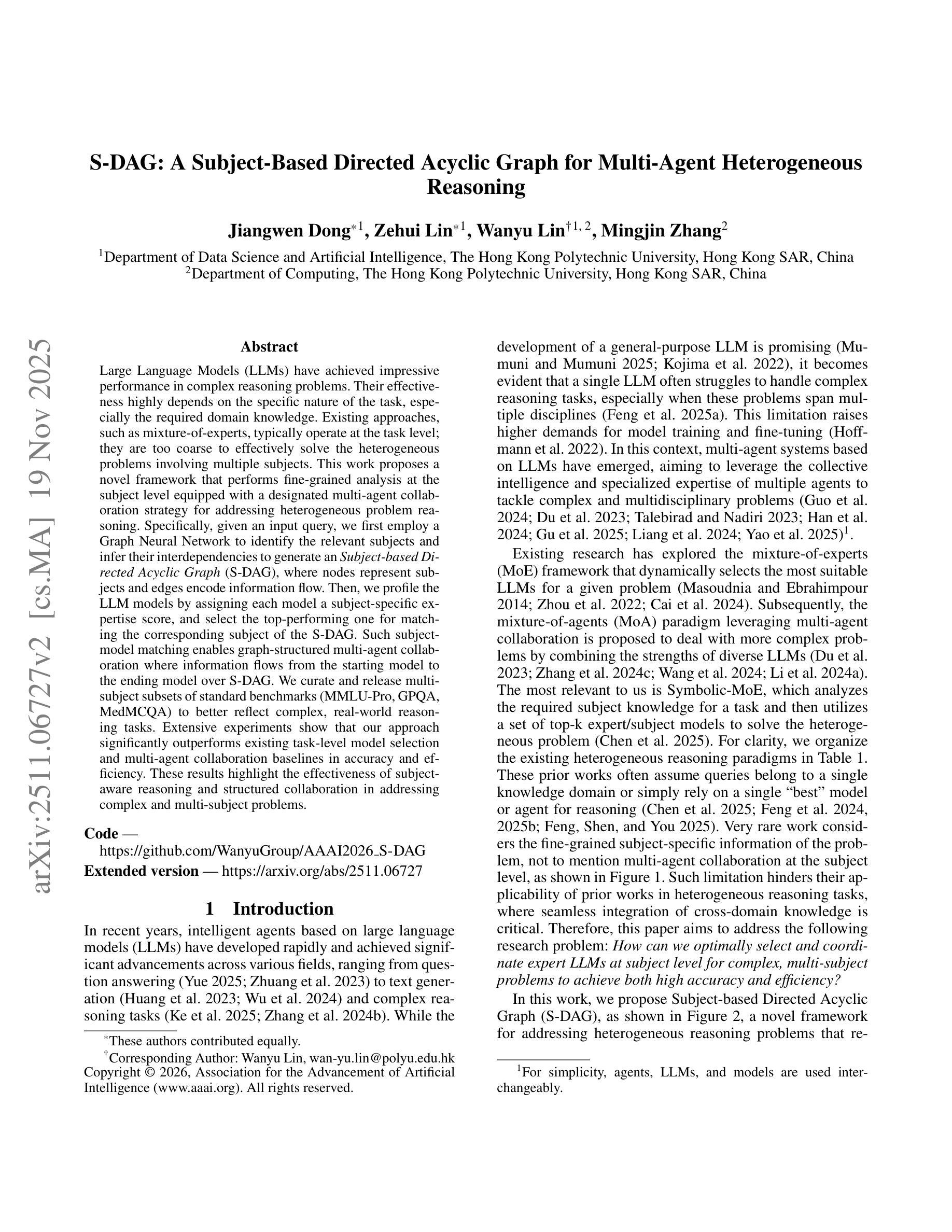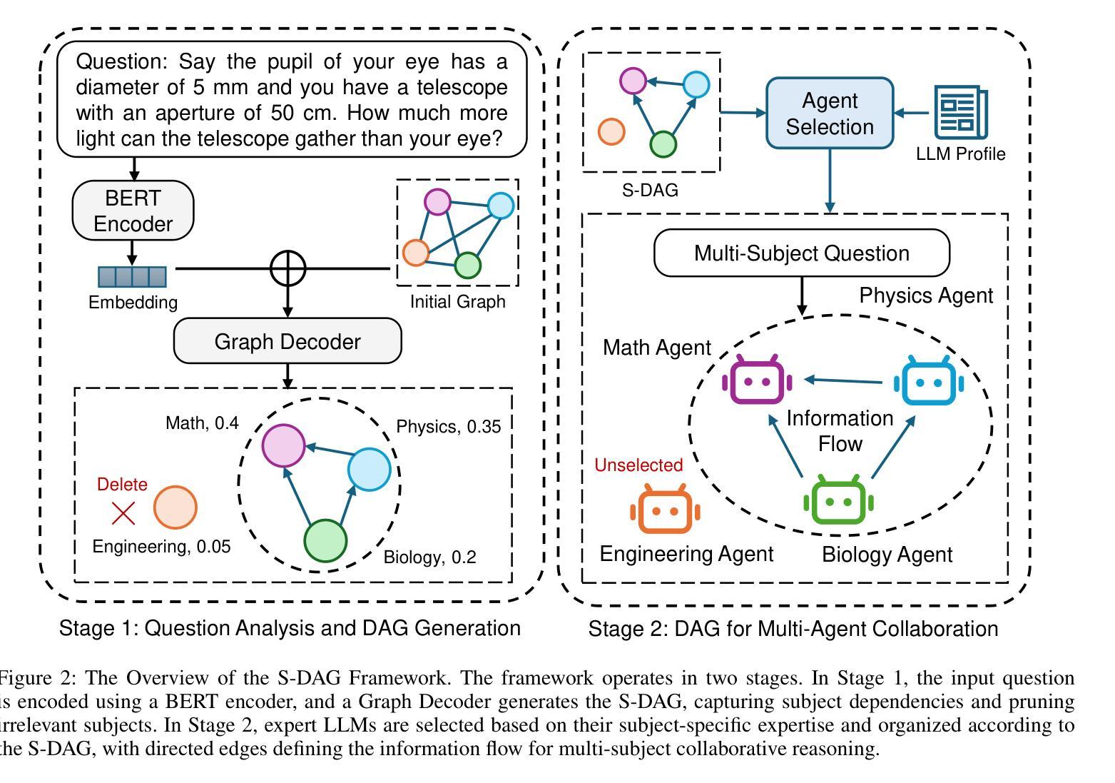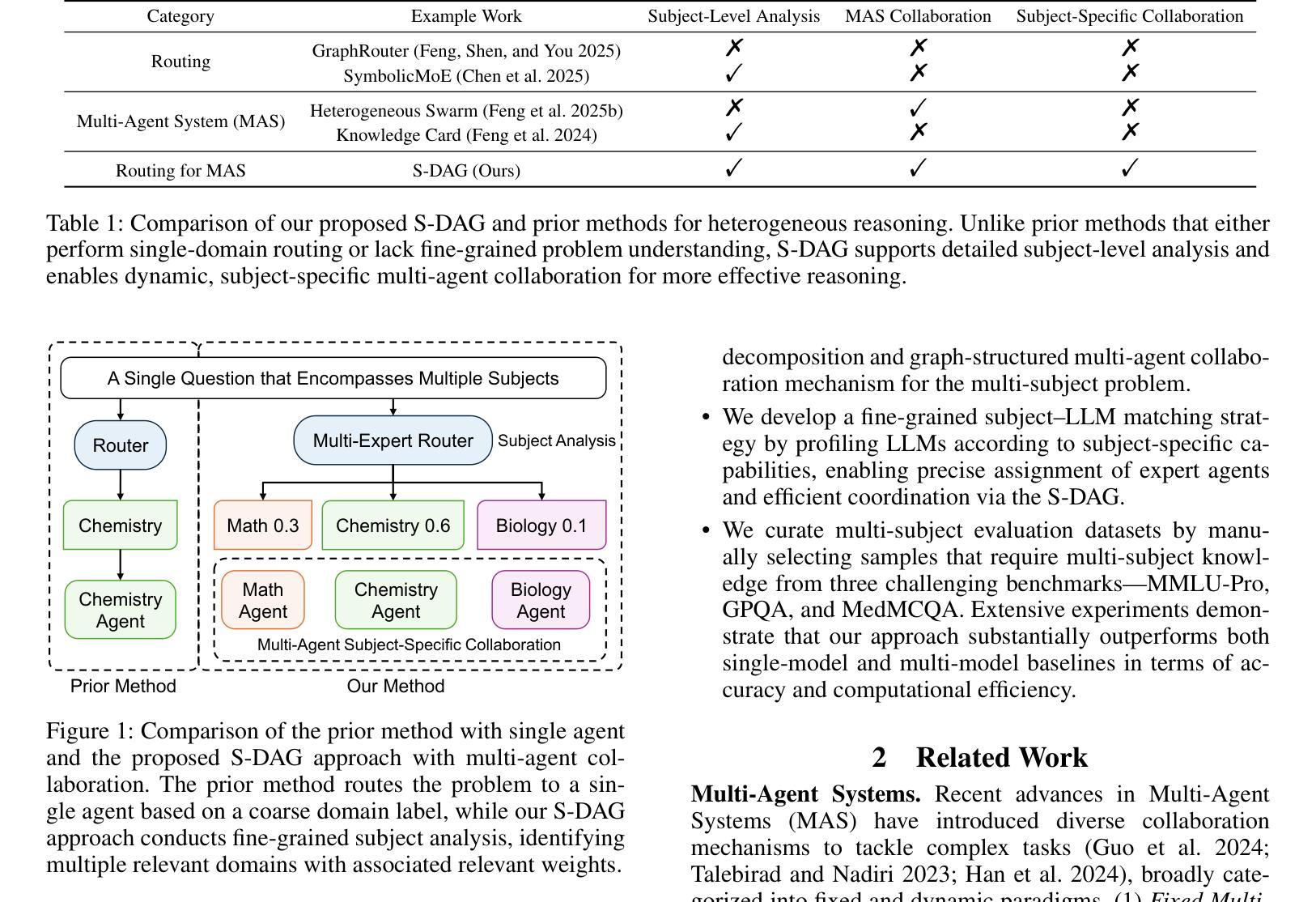 大型语言模型(LLMs)在处理复杂推理问题时表现出强大的性能,其效果高度依赖于任务的具体性质和所需的领域知识。现有方法如混合专家通常在任务层面操作,难以解决涉及多个主题的不同质问题。本研究提出一种新型框架,在主题层面进行精细分析,并配备专门的多智能体协作策略来解决异质性问题推理。通过输入查询,使用图神经网络识别相关主题并推断其相互依赖性,生成主题导向的无环图(S-DAG),其中节点代表主题,边缘编码信息流。通过为每种模型分配主题特定专业分数来评估LLM模型,并选择表现最佳的模型与S-DAG中的相应主题相匹配。这种主题模型匹配可实现图形结构的多智能体协作,信息从起始模型流经S-DAG流向最终模型。研究整理并发布了多主题子集的标准基准测试(MMLU-Pro、GPQA、MedMCQA),以更好地反映复杂、现实世界的推理任务。实验表明,该方法在准确性和效率方面显著优于现有的任务级别模型选择和多元智能协作基准测试。结果证明了主题感知推理和结构协作在解决复杂多主题问题中的有效性。