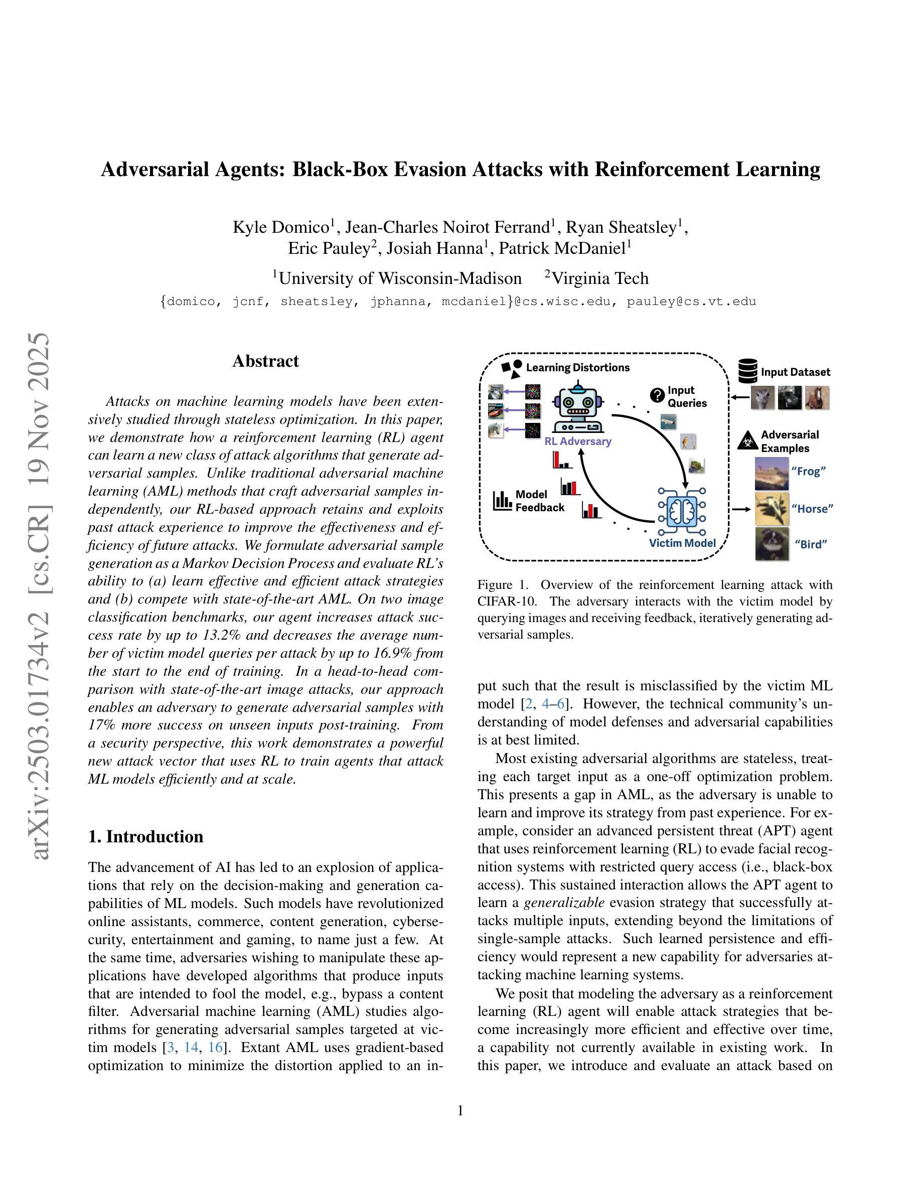 对机器学习模型的攻击已经通过无状态优化进行了广泛的研究。在本文中,我们展示了强化学习(RL)代理如何学习生成对抗样本的新类攻击算法。与传统的对抗性机器学习(AML)方法独立制作对抗样本不同,我们的基于RL的方法保留并利用过去的攻击经验,以提高未来攻击的有效性和效率。我们将对抗样本生成制定为马尔可夫决策过程,并评估RL(a)学习有效且高效的攻击策略的能力,(b)与最先进的AML竞争的能力。在两个图像分类基准测试中,我们的代理在训练过程中提高了攻击成功率,高达13.2%,并减少了每次攻击的受害者模型查询次数,高达16.9%。在与最先进的图像攻击的直接比较中,我们的方法使对手能够在训练后生成对抗样本时,在未见过输入的情况下提高成功率为训练前的约两倍。从安全角度来看,这项工作展示了一个强大的新攻击向量,该向量使用RL训练代理以大规模有效地攻击机器学习模型。