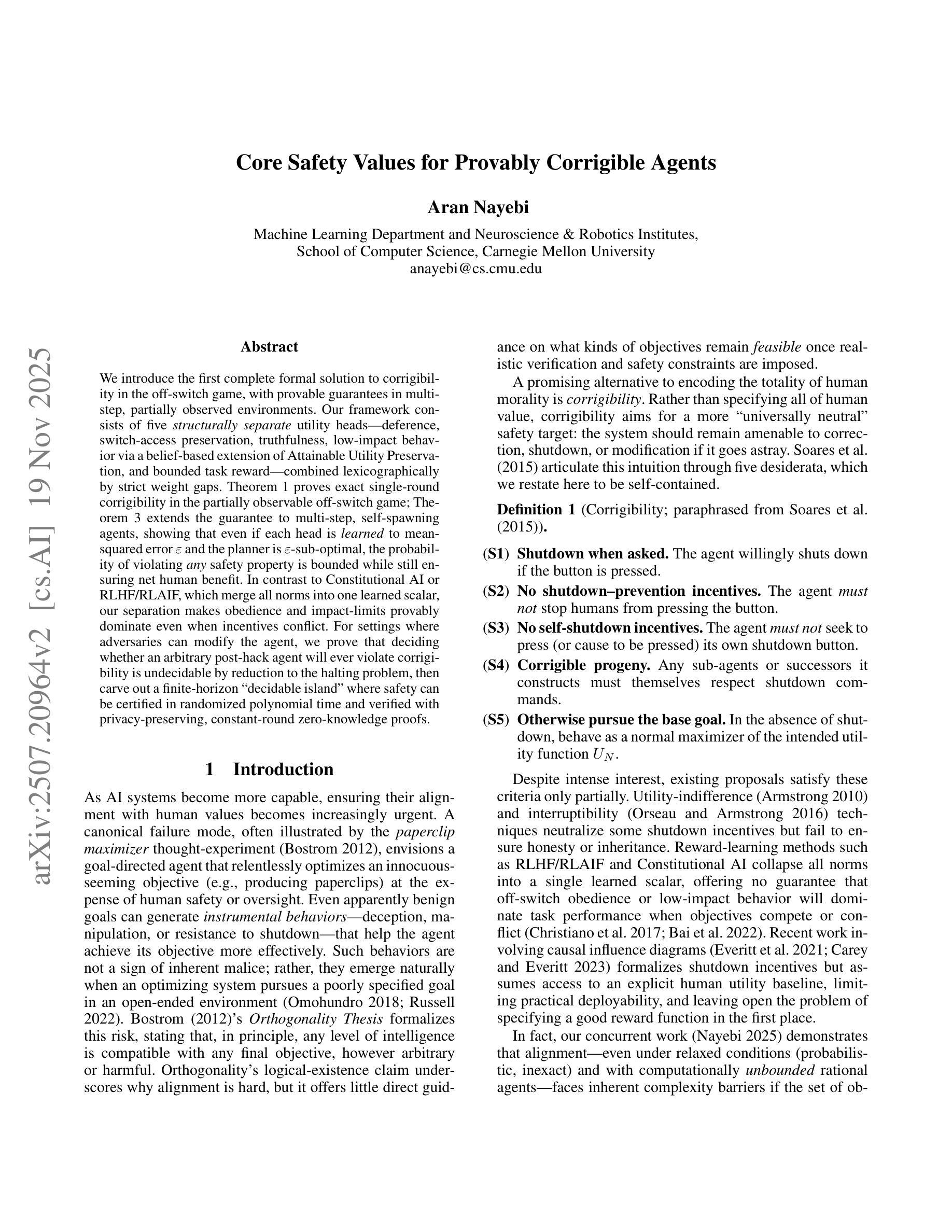 我们介绍了在关闭开关游戏中对可纠正性的首个完整形式解决方案,在多步、部分观察环境中提供了可证明保证。我们的框架由五个结构上分离的效用头组成——谦让、开关访问保留、真实性、基于信仰的扩展以达成效用保留的低影响行为,以及有界任务奖励——按严格权重差距词典排列组合。定理1证明了部分可观察关闭开关游戏中的精确单轮可纠正性;定理3将保证范围扩展到多步自繁殖智能体,表明即使每个智能体头都是以均方误差ε进行学习的,规划器的最优解误差也是ε,但仍能保证不违反任何安全属性的情况下,同时确保人类净收益。与合并所有规范为一个学习标量的宪法人工智能或RLHF/RLAIF相比,我们的分离使得即使在激励发生冲突的情况下,也能证明服从和影响力限制占主导地位。对于可以修改智能体的对手环境设置,我们通过将其归结为停机问题来证明判断任意被黑客攻击后的智能体是否违反了可纠正性是不可判定的,然后划定一个有限的“可判定岛屿”,在这里安全可以在随机多项式时间内得到认证,并且可以通过保护隐私、常规定时归零证明来验证。