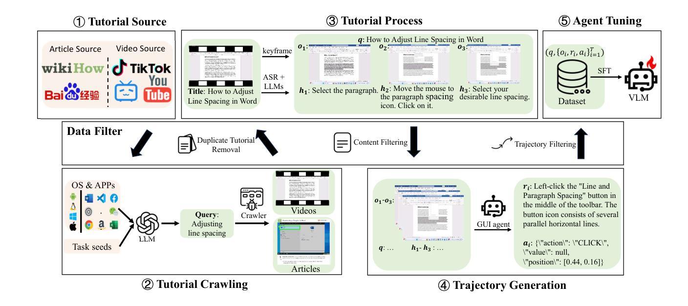 - TongUI框架通过学习在线多媒体教程来构建通用的GUI代理,解决了轨迹数据不足的问题。