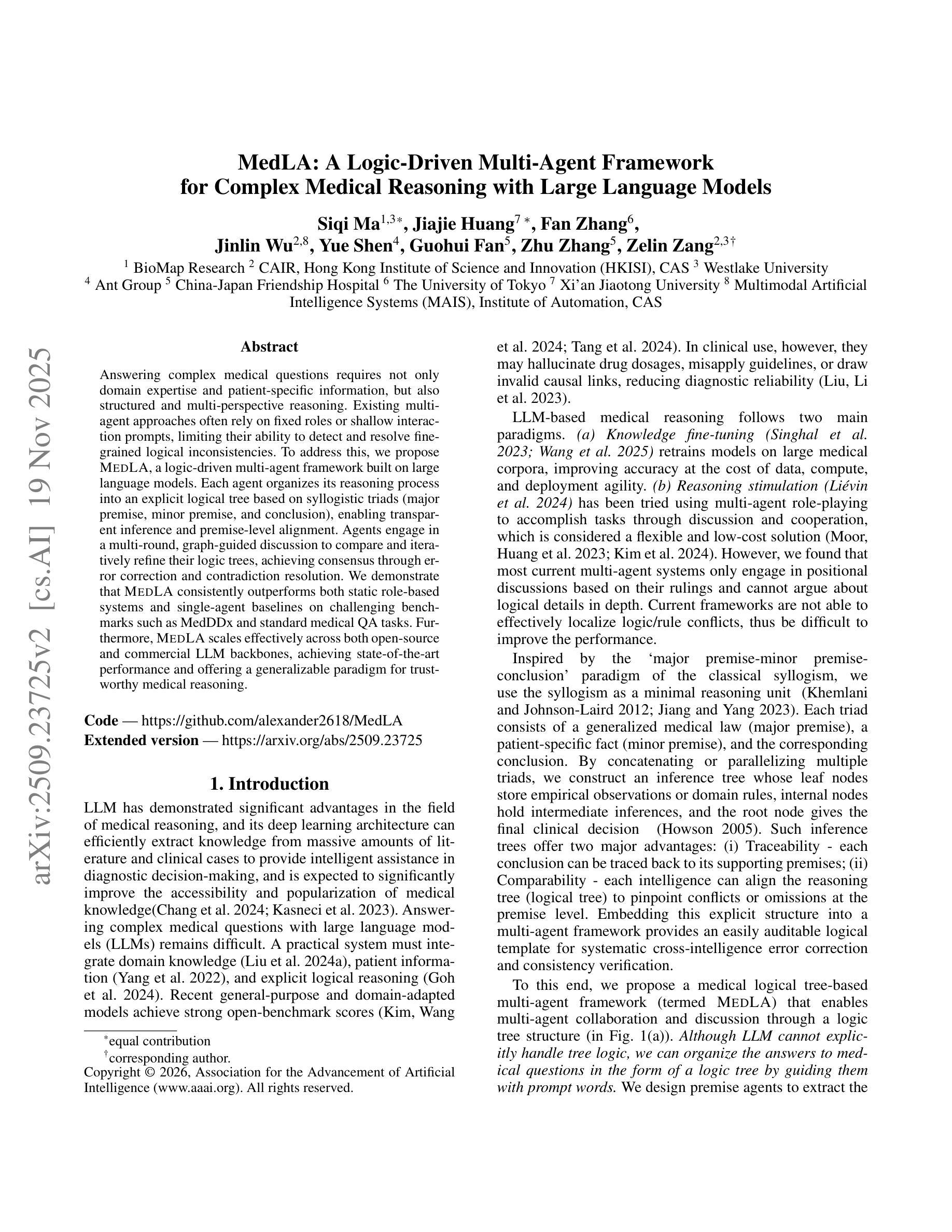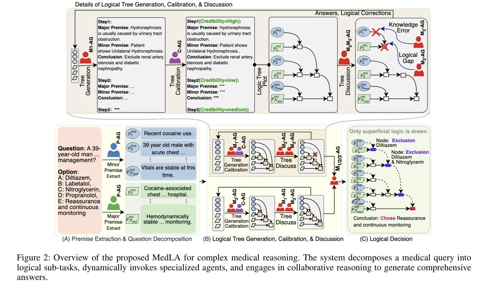 文本提出了一个逻辑驱动的多智能体框架MedLA,用于解决复杂的医疗问题。该框架基于大型语言模型构建,每个智能体通过逻辑树进行推理,逻辑树基于三段论(大前提、小前提和结论)进行组织,实现透明推理和前提级对齐。智能体通过多轮图形引导的讨论来比较和迭代优化其逻辑树,通过纠错和矛盾解决达成共識。在基准测试中,MedLA表现优异,可跨开源和商业大型语言模型进行有效扩展。