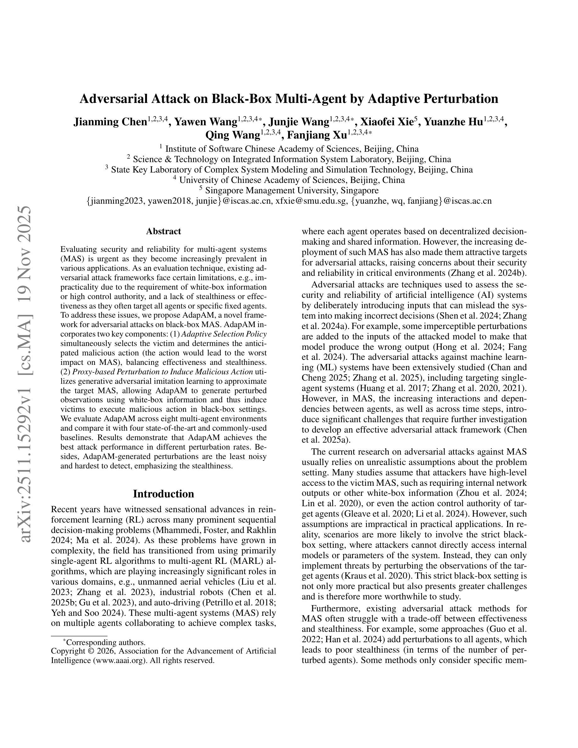 该文针对多智能体系统(MAS)的安全与可靠性评估提出了紧迫需求。现有对抗性攻击框架存在局限性,如需要白盒信息和高控制权限的不实用性,以及缺乏针对所有智能体或特定固定智能体的隐形和有效性。为此,提出了一种新型对抗性攻击框架AdapAM,适用于黑盒MAS。其核心组件包括自适应选择策略和基于代理的扰动诱导恶意行动。自适应选择策略可平衡有效性和隐蔽性,同时选择受害者和预期的恶意行动。基于代理的扰动诱导恶意行动利用生成对抗性模仿学习来逼近目标MAS,使AdapAM能够在黑箱环境中利用白箱信息生成扰动观察并诱导受害者执行恶意行动。在多个环境中评估AdapAM,结果表明其在不同扰动率下达到最佳攻击性能,且生成的扰动最不易被检测。