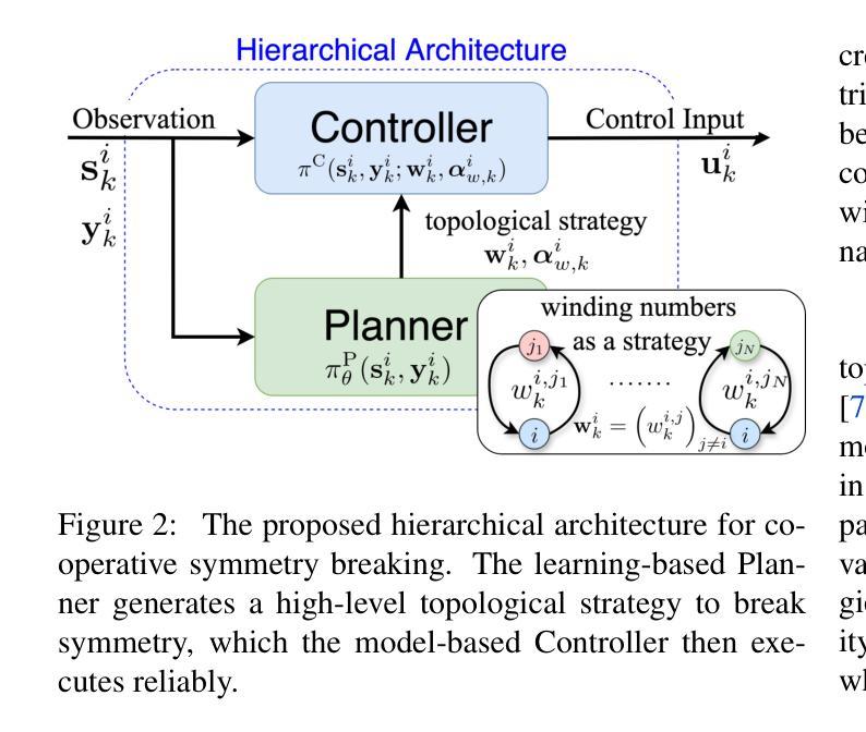 我们提出了一种新的分层导航方法,以解决分布式多智能体导航中由对称性引起的死锁这一基本挑战。当多个智能体相互作用时,它们自主打破对称性的决策方式本身就是困难的。为了解决这个问题,我们引入了一种方法,使用称为缠绕数的拓扑不变量来量化合作对称破缺策略,并通过强化学习来学习这些策略本身。我们的方法具有分层策略,包括基于学习的规划器,用于规划拓扑合作策略,以及基于模型的控制器,用于执行这些策略。通过强化学习,规划器学习为控制器生成两种类型的参数:一种是由缠绕数表示的拓扑合作策略,另一组是动态权重,用于确定在多个智能体同时交叉的密集场景中应优先与哪个智能体进行交互。然后,控制器根据规划器提供的策略和权重生成无碰撞和高效的动作。这种分层结构结合了基于学习方法的灵活决策能力与基于模型的可靠性。仿真和真实机器人实验表明,我们的方法在密集环境中优于现有基线,能够高效避免碰撞和死锁,同时实现出色的导航性能。实验的代码可在https://github.com/omron-sinicx/WNumMPC找到。