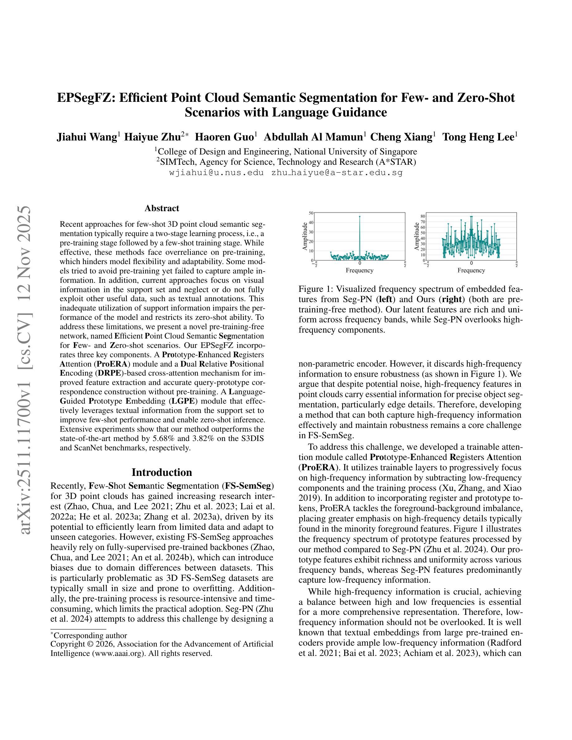 本文介绍了一种无需预训练的高效点云语义分割网络,名为EPSegFZ。该网络通过引入ProERA模块和DRPE交叉注意力机制提高特征提取能力,构建准确的查询原型对应关系,同时利用支持集中的文本信息,提高少样本性能并实现零样本推理。在S3DIS和ScanNet基准测试上,该方法优于现有技术,分别提高了5.68%和3.82%。