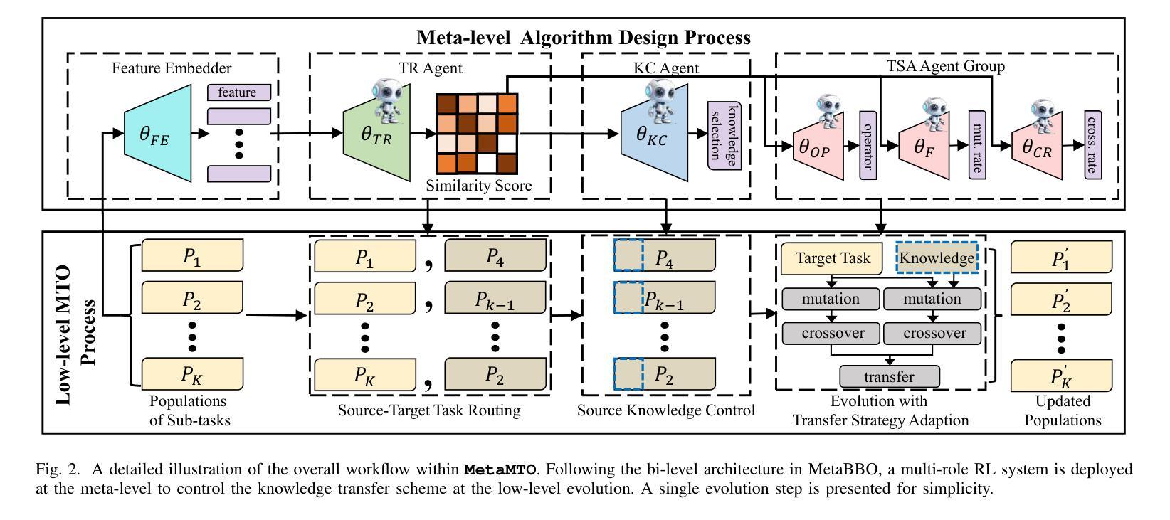 代理辅助进化算法(SAEAs)广泛应用于昂贵的黑箱优化。然而,它们在搜索过程中依赖于刚性、手动设计的组件,如填充标准和进化策略,这限制了它们在任务中的灵活性。为了解决这些局限性,我们提出了双控制双空间代理辅助进化算法(DB-SAEA),这是一种针对多目标问题的MetaBBO框架。DB-SAEA学习一种元策略,联合调控候选生成和填充标准选择,实现双重控制。DB-SAEA中的双空间探索景观分析(ELA)模块采用基于注意力的架构,从真实和代理评估空间中捕获优化状态,同时确保跨问题维度、群体大小和目标的可扩展性。此外,我们整合TabPFN作为代理模型,进行准确高效的预测,同时估计不确定性。该框架通过强化学习进行训练,利用并行采样和集中训练来提高效率和跨任务的迁移能力。实验结果表明,DB-SAEA不仅在多种基准测试中优于最新基线,而且在更高维度设置中的未知任务上表现出强大的零镜头迁移能力。这项工作推出了首个具有对SAEAs进行双重控制和捕获代理模型信息的双空间ELA的MetaBBO框架。