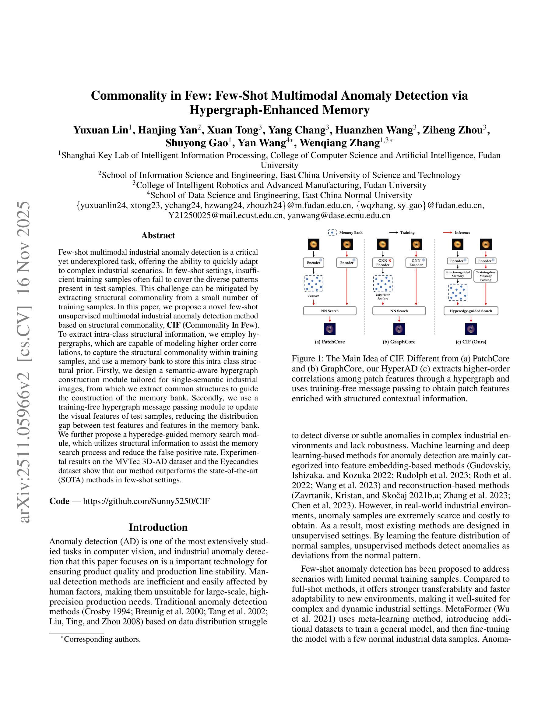本文提出一种基于结构共性(CIF)的少样本无监督多模态工业异常检测方法。该方法利用超图捕捉训练样本的结构共性,并用内存库存储此类结构先验。此外,它还利用无训练超图消息传递模块更新测试样本的视觉特征,并借助超边引导内存搜索模块来缩小分布差距,降低误报率。在MVTec 3D-AD和Eyecandies数据集上的实验表明,该方法在少样本环境下优于现有技术。